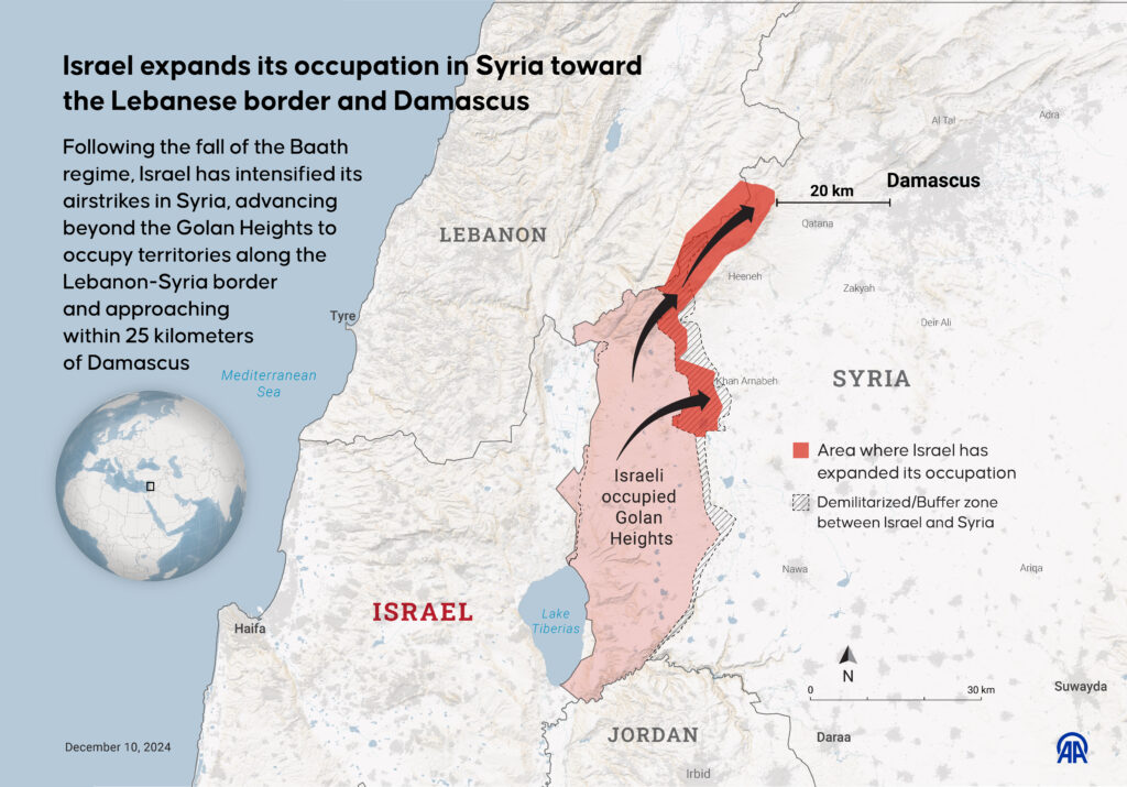 Following the fall of the Baath regime, Israel has intensified its airstrikes in Syria, advancing beyond the Golan Heights to occupy territories along the Lebanon-Syria border and approaching within 25 kilometers of Damascus. ( Murat Usubali – Anadolu Agency )