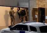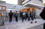 Department of Homeland Security agents, with masks and shields, come out of the Immigration and Customs Enforcement facility in Portland, Ore., on Sept. 28, 2025.