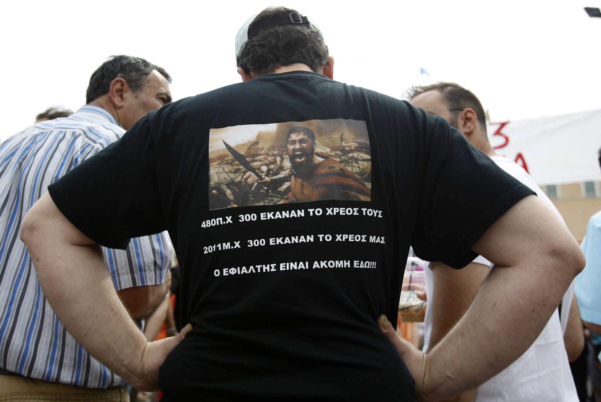 An anti-austerity demonstrator wears a T-shirt in Athens showing a cinematic depiction of a Spartan battle, on June 15, 2011. (AP/Kostas Tsironis)