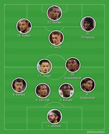 And as there is no Salah in the XI, we expect Jeremie Frimpong to start on the right wing, with Cody Gakpo and Ekitike alongside.
