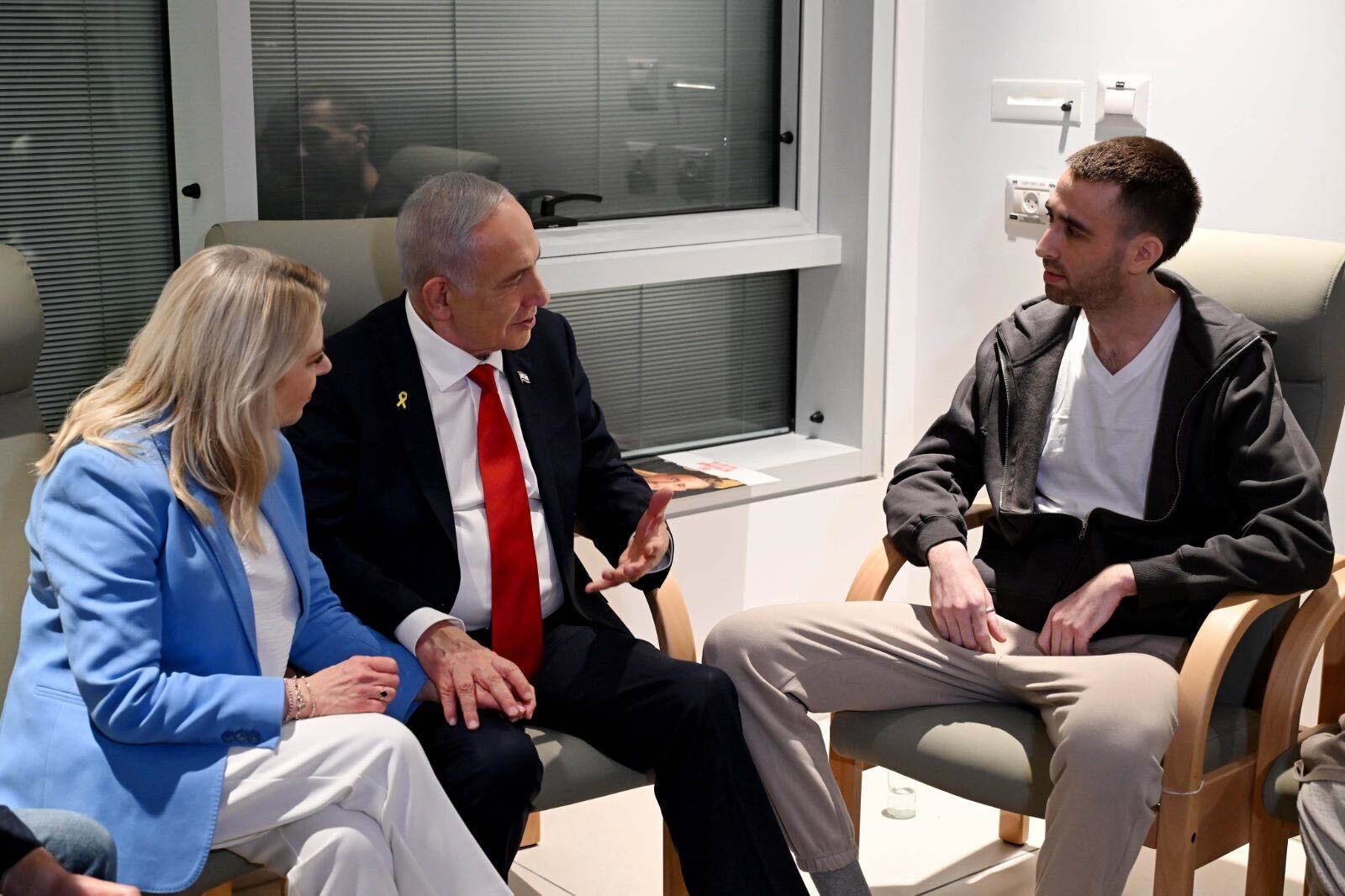 Prime Minister Benjamin Netanyahu and his wife Sara visiting released hostage Alon Ohel at Beilinson Hospital, in Petah Tikva, October 14, 2025. (Avi Ohayon/GPO)