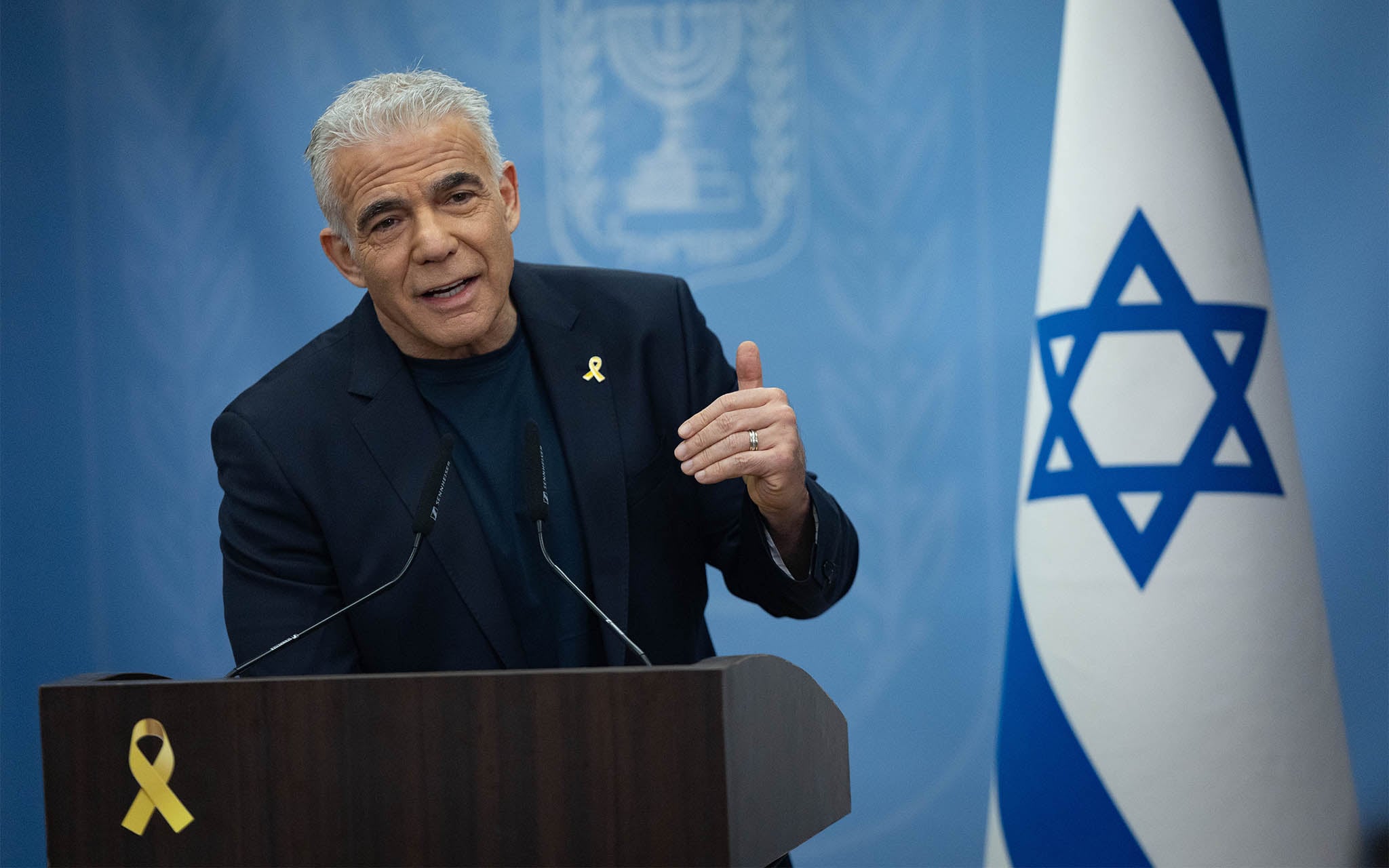 Opposition Leader Yair Lapid leads a faction meeting at the Knesset, in Jerusalem, on August 4, 2025. (Yonatan Sindel/Flash90)
