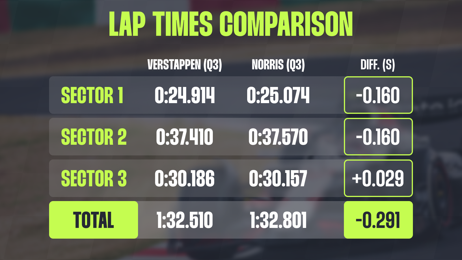 The Briton then had a very strong run through Turns 16, 17, and 18, where he managed to noticeably reduce the gap, but not enough to swing the advantage in his favour. In the end, Verstappen was almost three tenths quicker, which for this season’s standards is a relatively big gap.