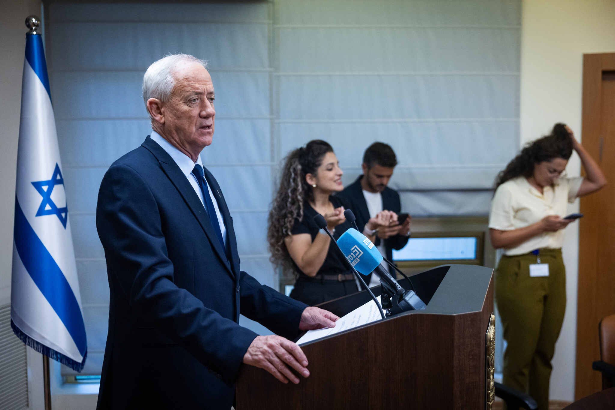 National Unity Party MK Benny Gantz leads a faction meeting at the Knesset, June 30, 2025. (Chaim Goldberg/Flash90)