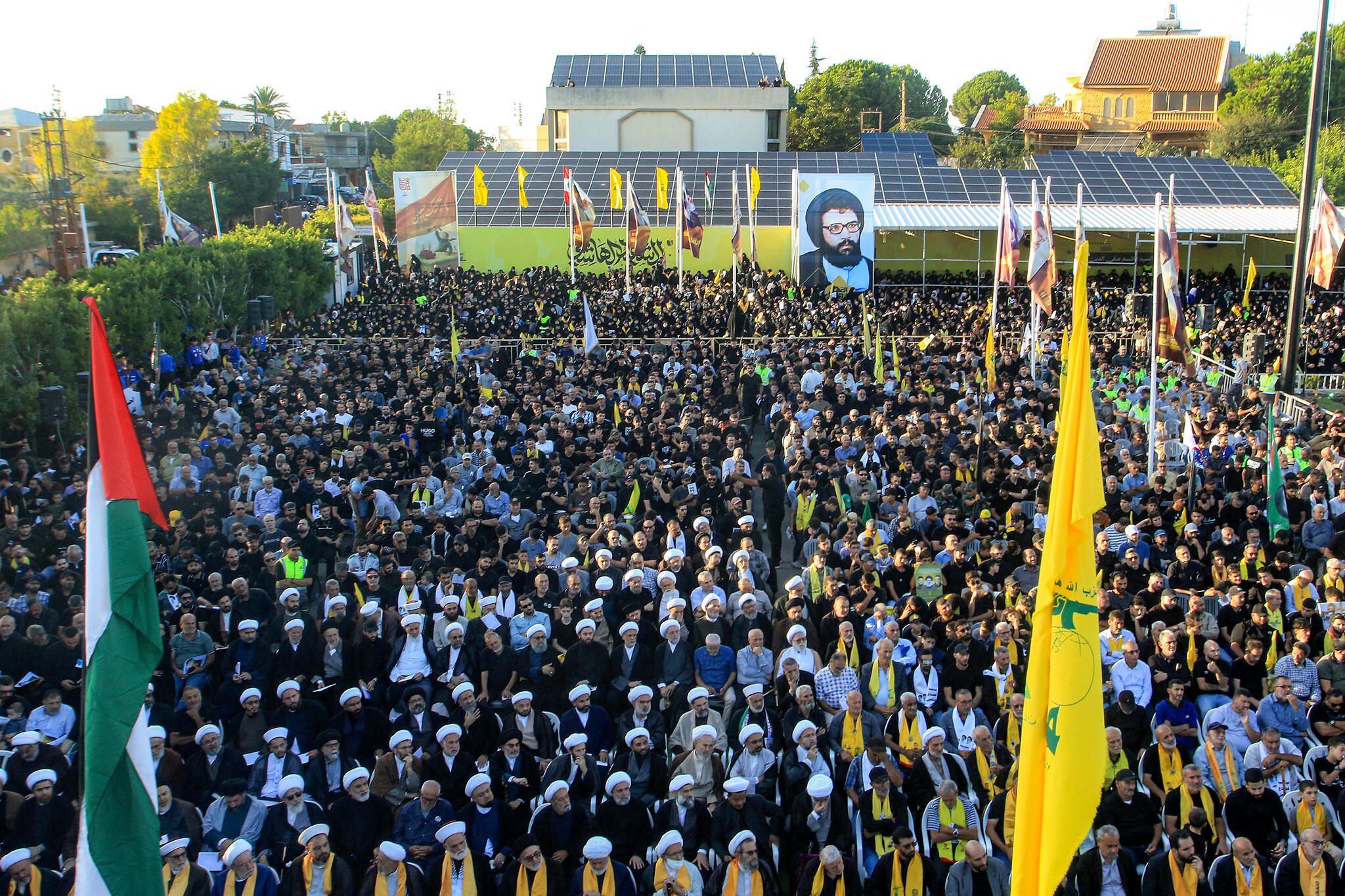Mourners attend a ceremony marking the first anniversary of Israel’s assassination of the longtime leader of Hezbollah, Hassan Nasrallah, and other group leaders in the town of Deir Qanoun al-Nahr near Tyre in southern Lebanon on September 27, 2025. (Mahmoud ZAYYAT / AFP)