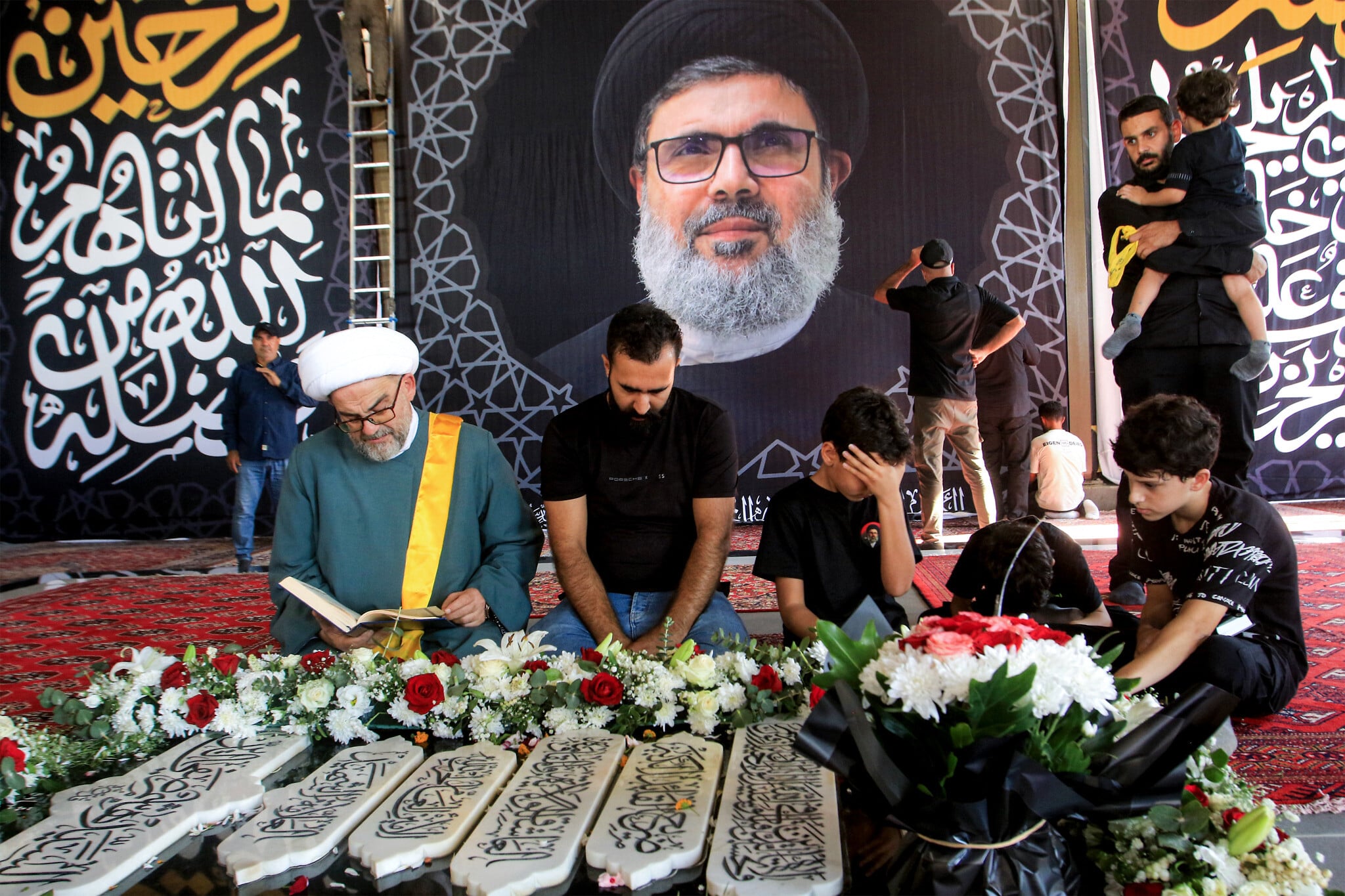 Mourners pray by the grave of Hashem Safieddine, the slain leader of Hezbollah, during a ceremony marking the first anniversary of Israel’s assassination of Safieddine alongside the group’s longtime leader Hassan Nasrallah and other officials, at Safieddine’s shrine in the town of Deir Qanoun al-Nahr near Tyre in southern Lebanon on September 27, 2025. (Mahmoud ZAYYAT / AFP)