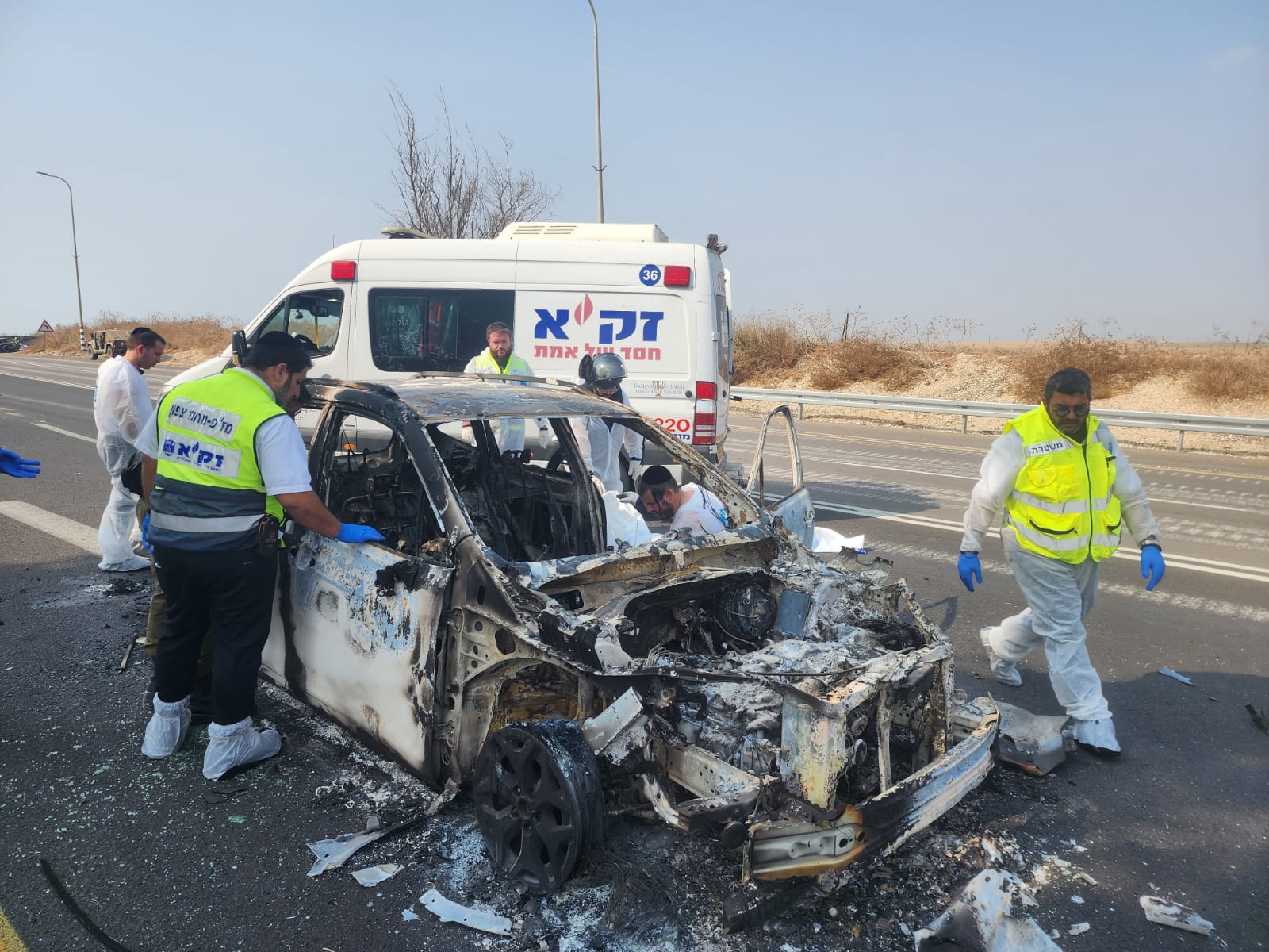 ZAKA volunteers work on the road near the Supernova Festival soon after the October 7 massacre. (Zohar Shpak/ZAKA)