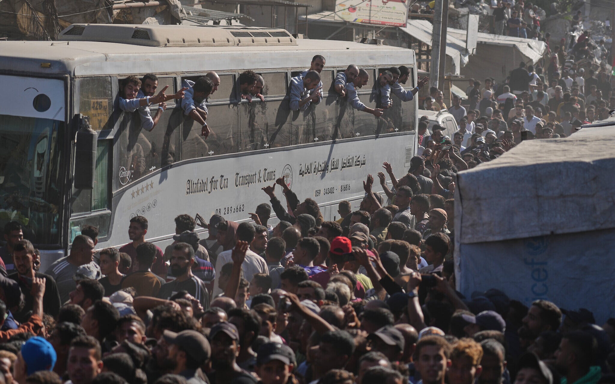 People gather to greet freed Palestinian prisoners arriving on buses in the Gaza Strip after their release from Israeli jails under a ceasefire agreement between Hamas and Israel, outside Nasser Hospital in Khan Younis, southern Gaza Strip, Oct. 13, 2025. (AP Photo/Jehad Alshrafi)