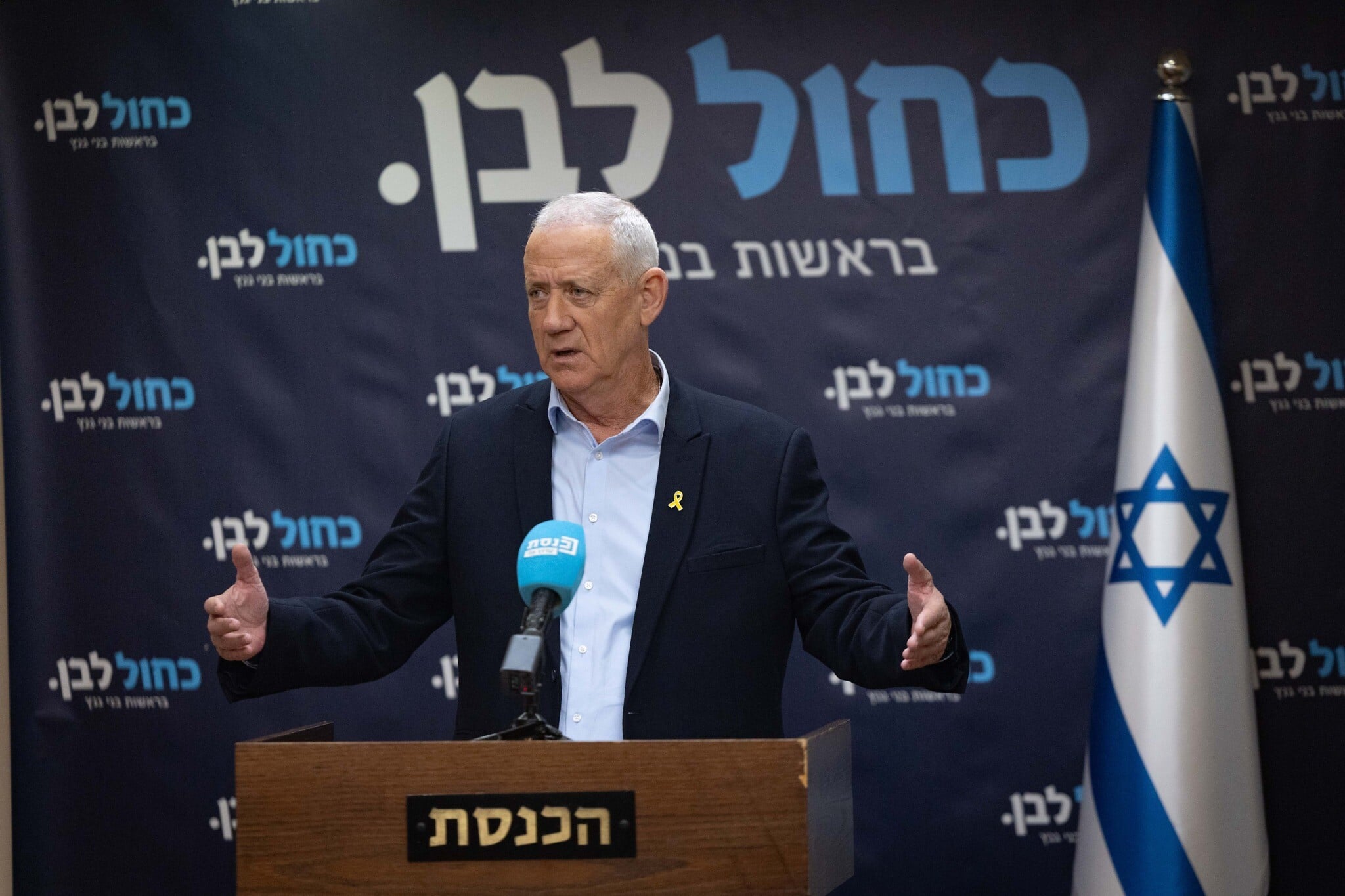 Leader of the Blue and White Party MK Benny Gantz leads a faction meeting at the Knesset on October 27, 2025 (Yonatan Sindel/Flash90)