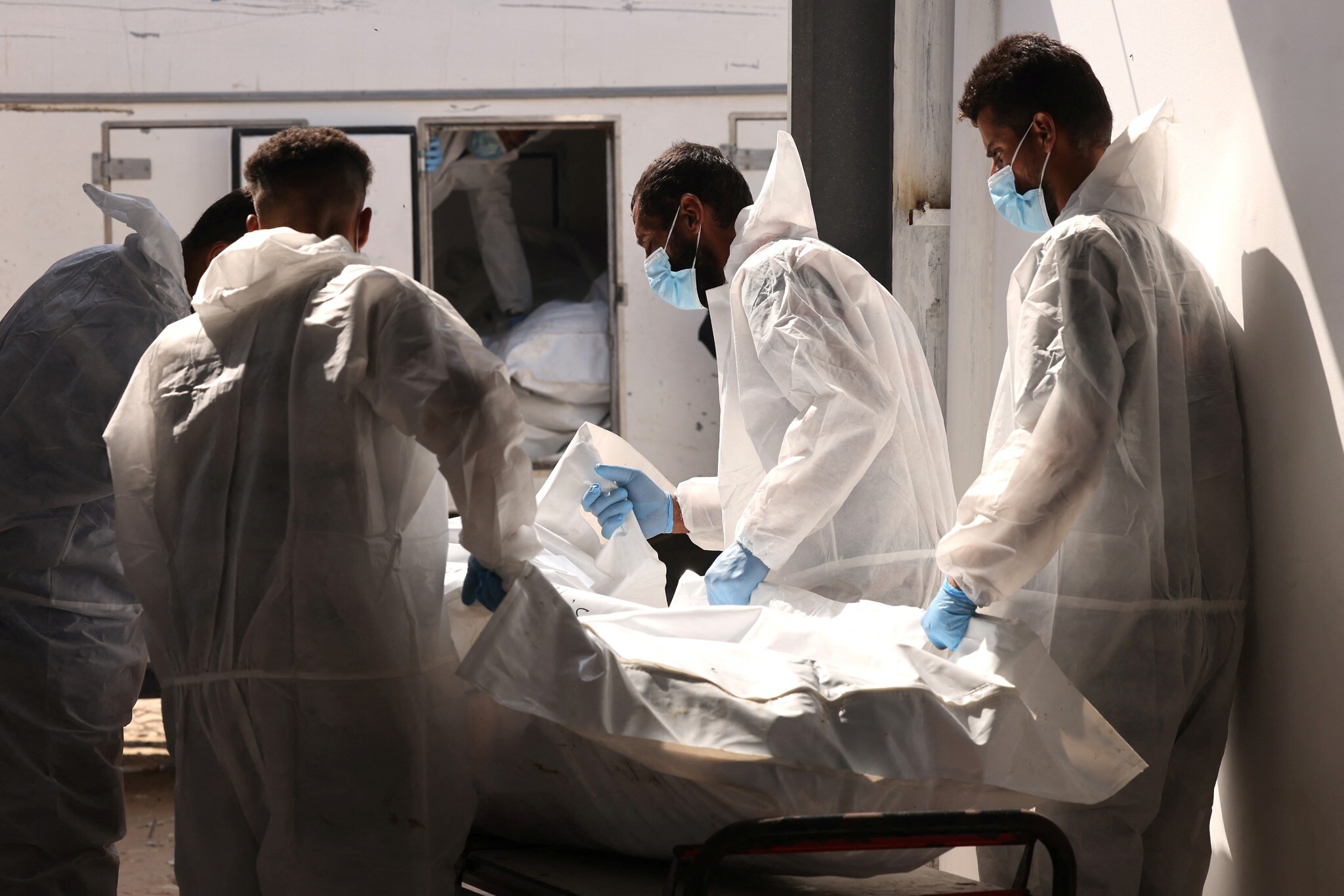 Employees of the Nasser Medical Complex move body bags of the 30 bodies of Palestinians released as part of the hostage exchange deal, as they arrive in Khan Younis, in the southern Gaza Strip, on October 31, 2025 (AFP)