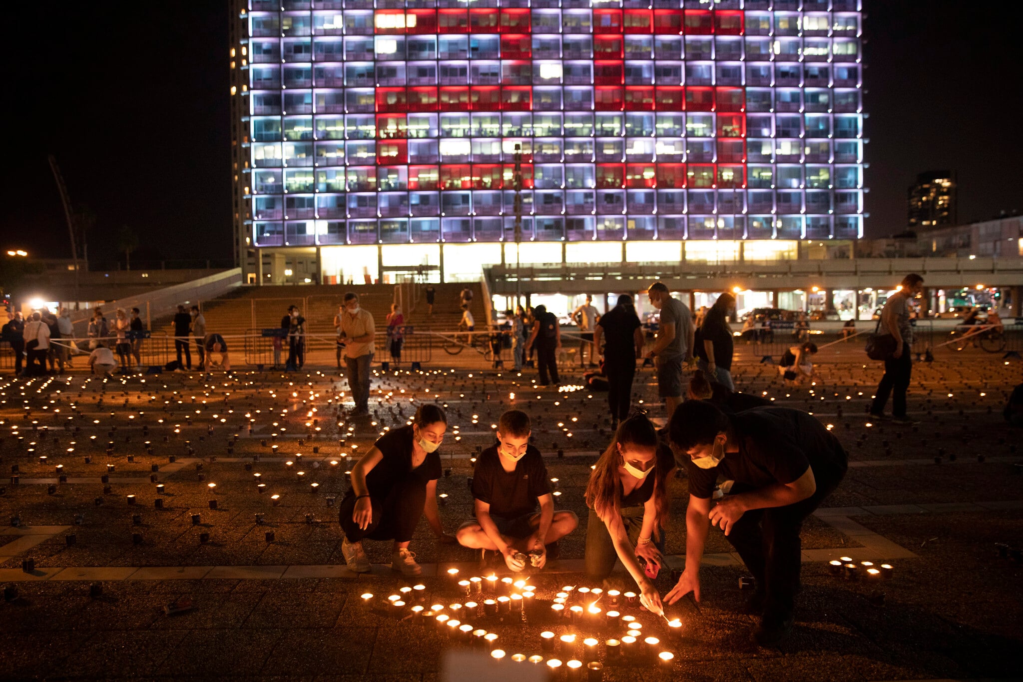 Israelis light memorial candles on the 25th anniversary of the assassination of Israeli Prime Minister Yitzhak Rabin, at Rabin Square, Tel Aviv, Israel, Thursday, Oct. 29, 2020. (AP/Oded Balilty)