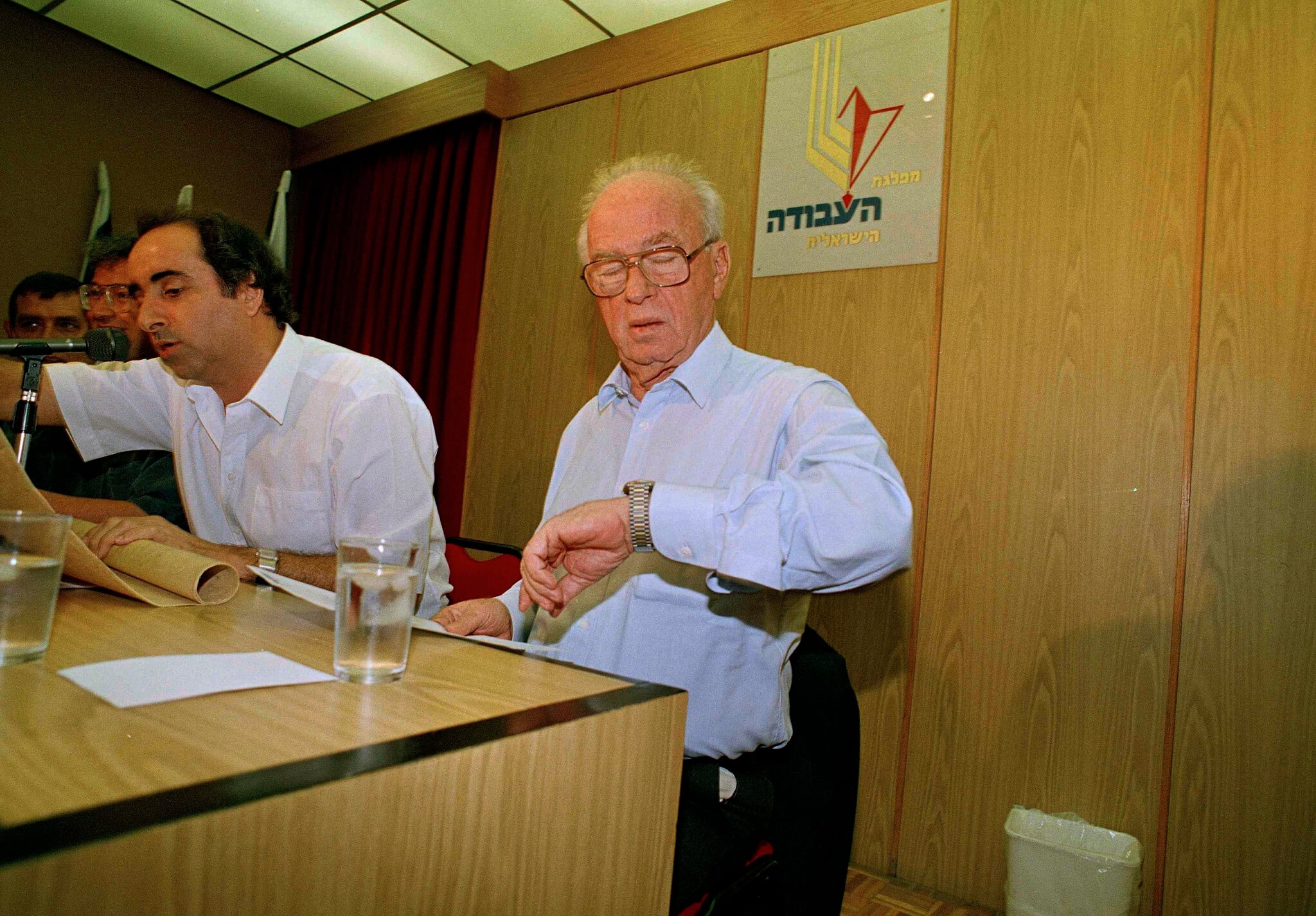 Israeli Prime Minister Yitzhak Rabin looks at his watch during a Labor Party function in Tel Aviv, Sept. 2, 1993. (AP/Nati Harnik)