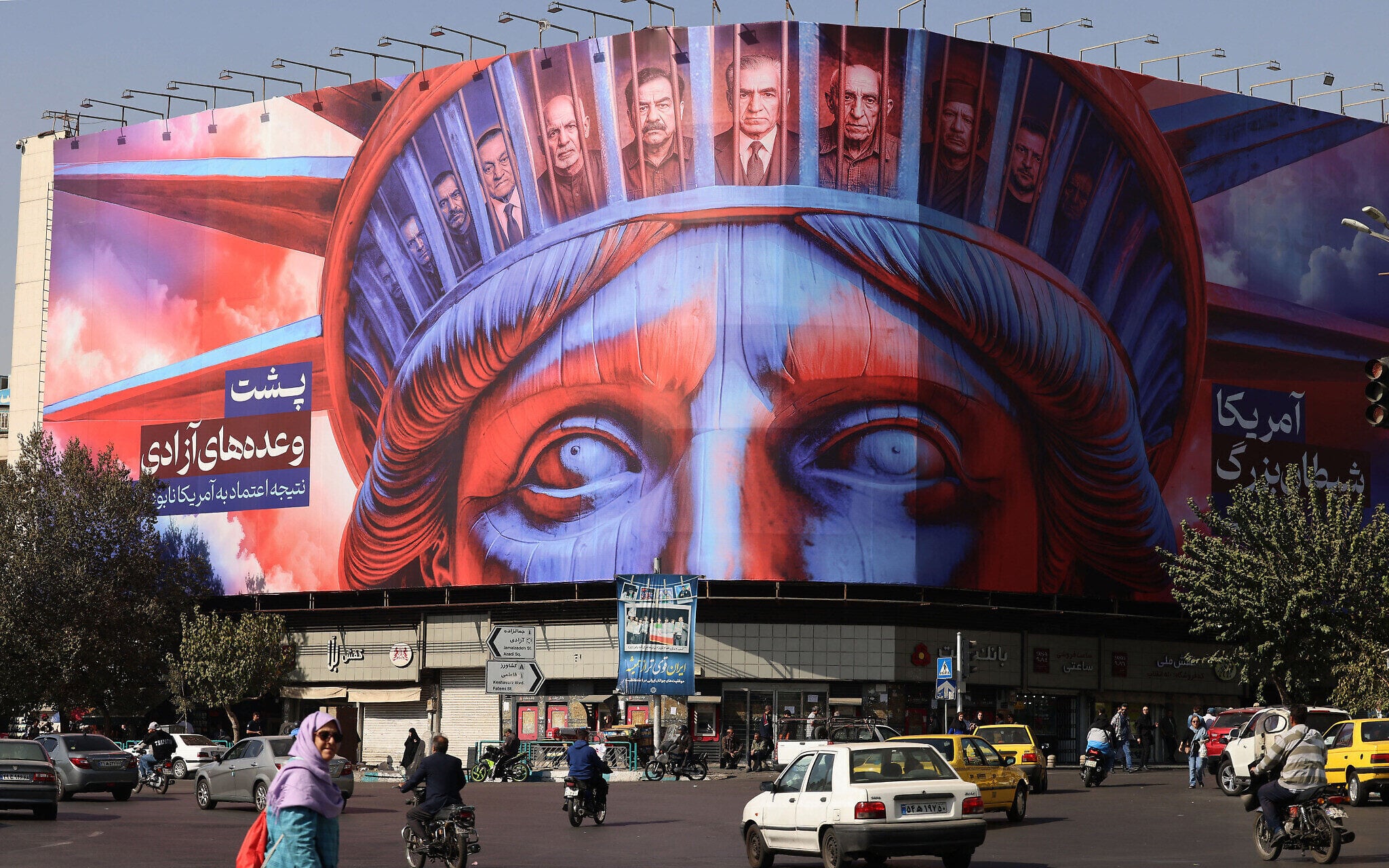 People walk past a large banner depicting the Statue of Liberty with a Persian message reading, ‘The promise of American freedom,’ in Tehran’s Revolution Square as Iranians mark 46 years since pro-Islamic Republic Iranian students took 52 US embassy staff hostage, on November 4, 2025. (ATTA KENARE / AFP)