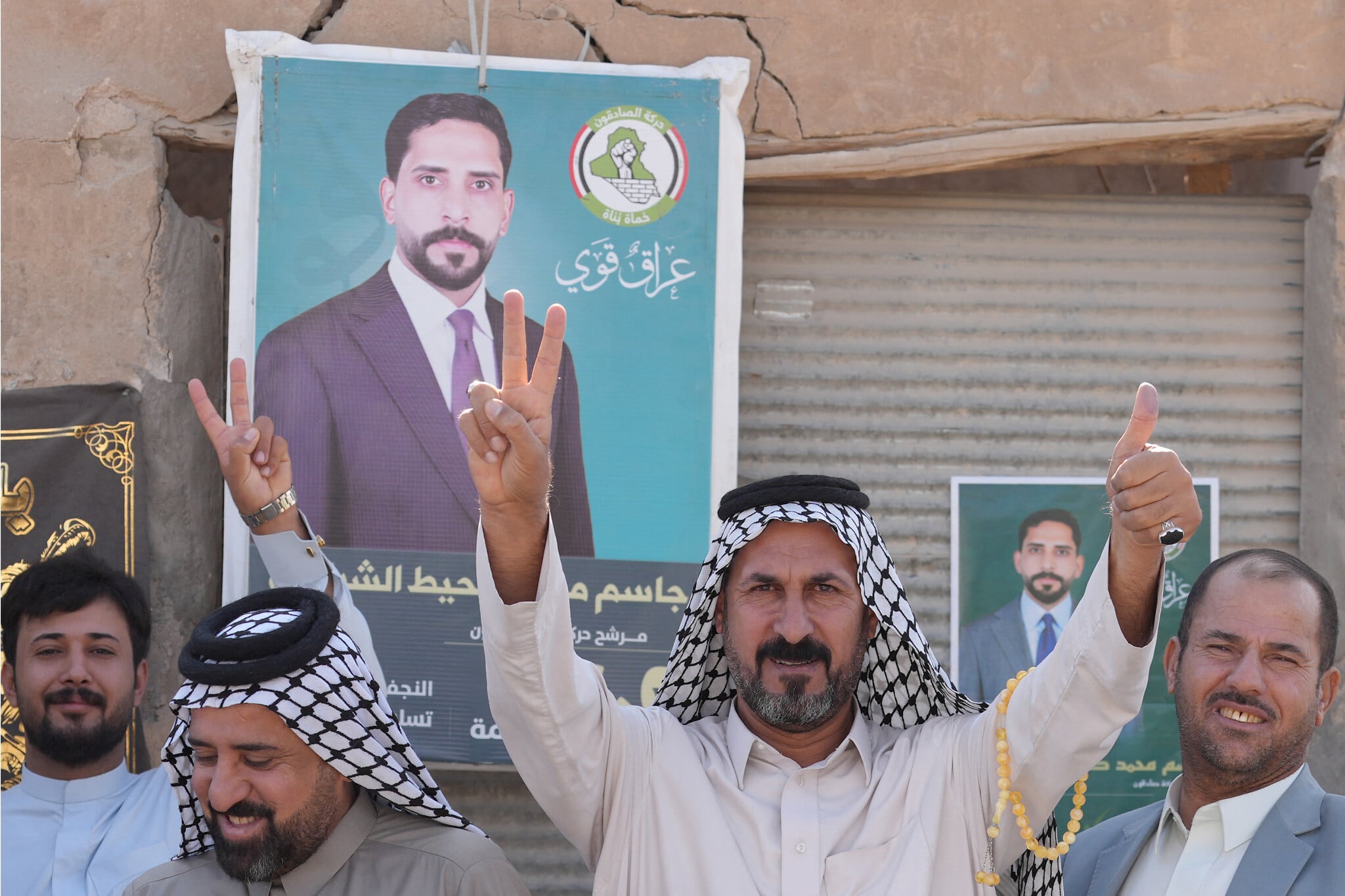 Iraqi men in traditional dress flash the V-sign for victory as they gather in the working-class neighborhood of al-Thawra, in the central city of Najaf, on November 11, 2025, during Iraq’s parliamentary elections. (Qassem al-KAABI / AFP)