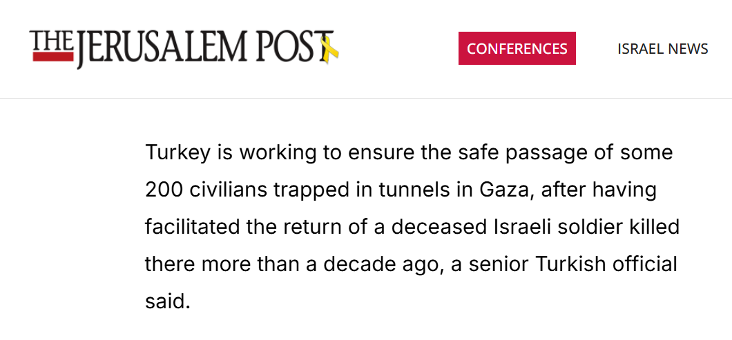Notably, the “civilians [sic] in question in the Turkish officials’ statements refer to the same Hamas terrorists stuck on the other side of the yellow line that mediators are working to exonerate.