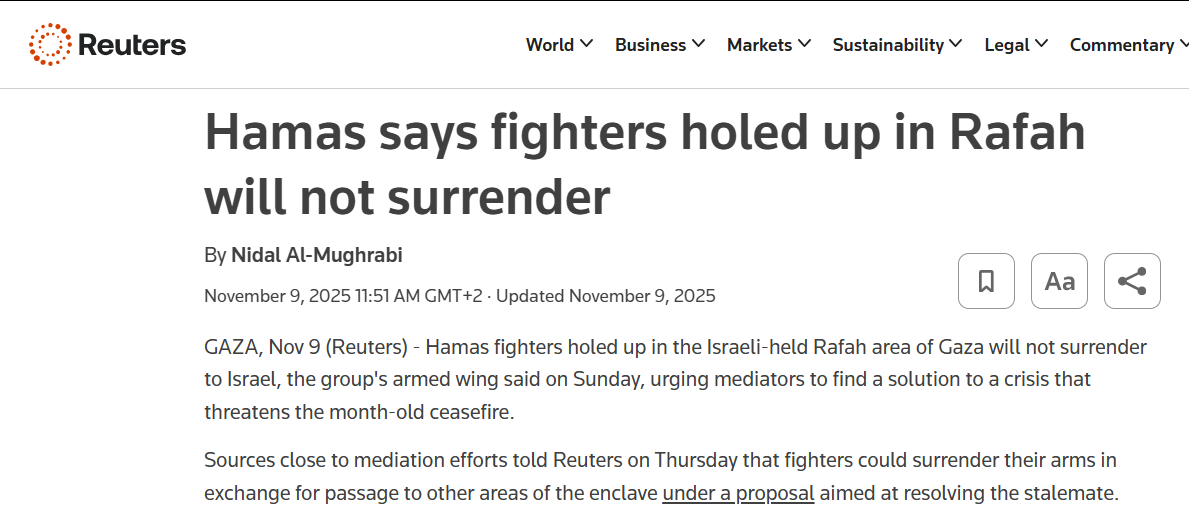 Elsewhere, Reuters correctly reported in detail that those trapped in the tunnels are Hamas fighters. A Nov. 9 article, for instance, accurately reported (“Hamas says fighters holed up in Rafah will not surrender“):