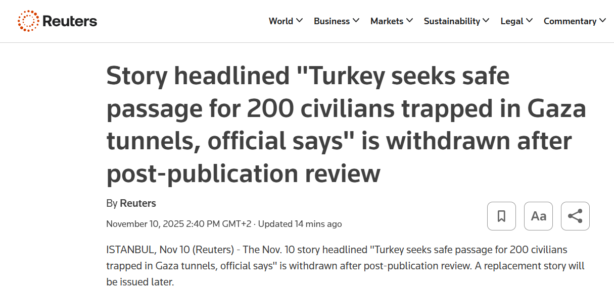 Following communication from CAMERA’s Israel office, Reuters editors commendably withdrew the story and says the piece will later be replaced with another. As of this writing (8:30 am ET), readers who visit the page will find a headline stating: “Story headlined ‘Turkey seeks safe passage for 200 civilians trapped in Gaza tunnels, official says’ is withdrawn after post-publication review.”