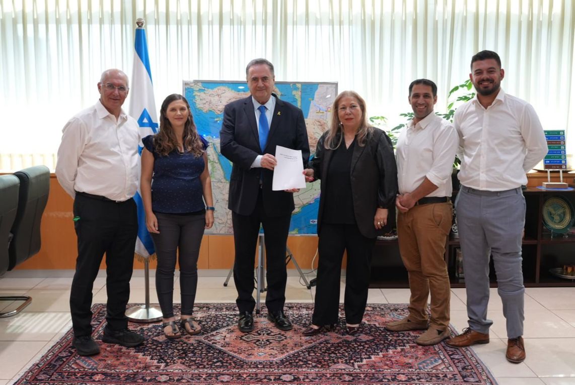 Defense Minister Israel Katz (center) receives a report from members of a committee that looked into the operations of Army Radio, on October 28, 2025. (Defense Ministry)