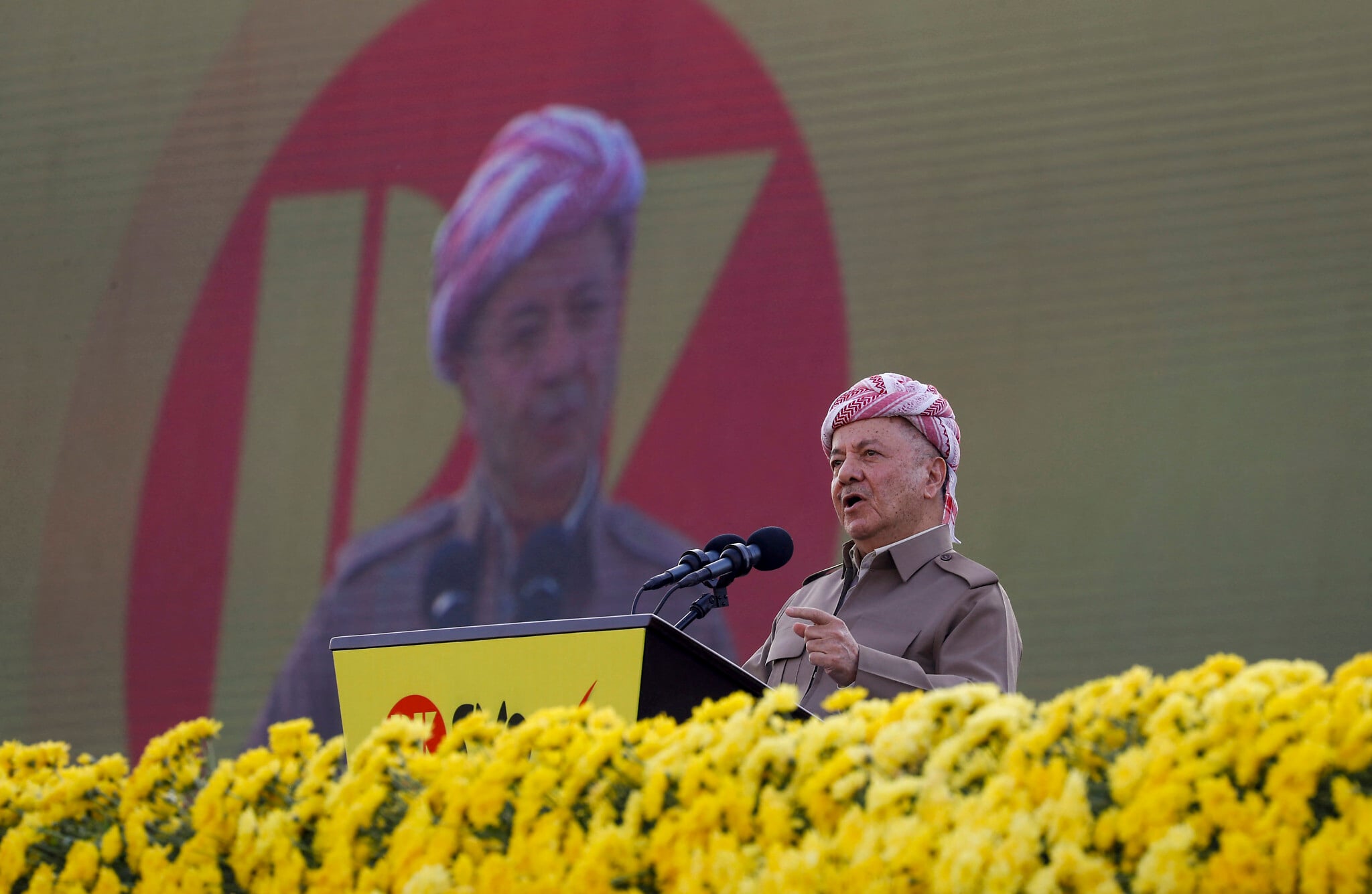 Masoud Barzani, leader of the Kurdistan Democratic Party (KDP), speaks during the party’s electoral campaign rally at Franso Hariri Stadium in Arbil on November 7, 2025 ahead of the country’s parliamentary elections. Iraq will hold parliamentary elections on November 11. (Safin HAMID / AFP)