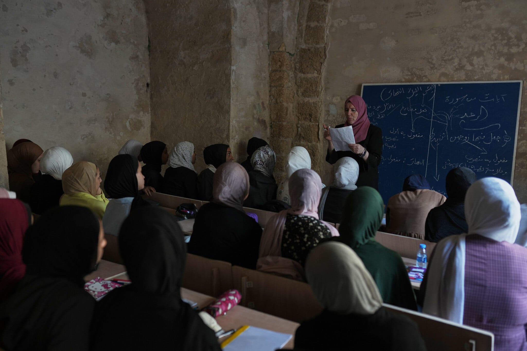 Palestinian high school students return to class weeks after a ceasefire was announced between Israel and Hamas, at the Kamilia School in the Old City of Gaza City, November 12, 2025. (AP Photo/Jehand Alshrafi)