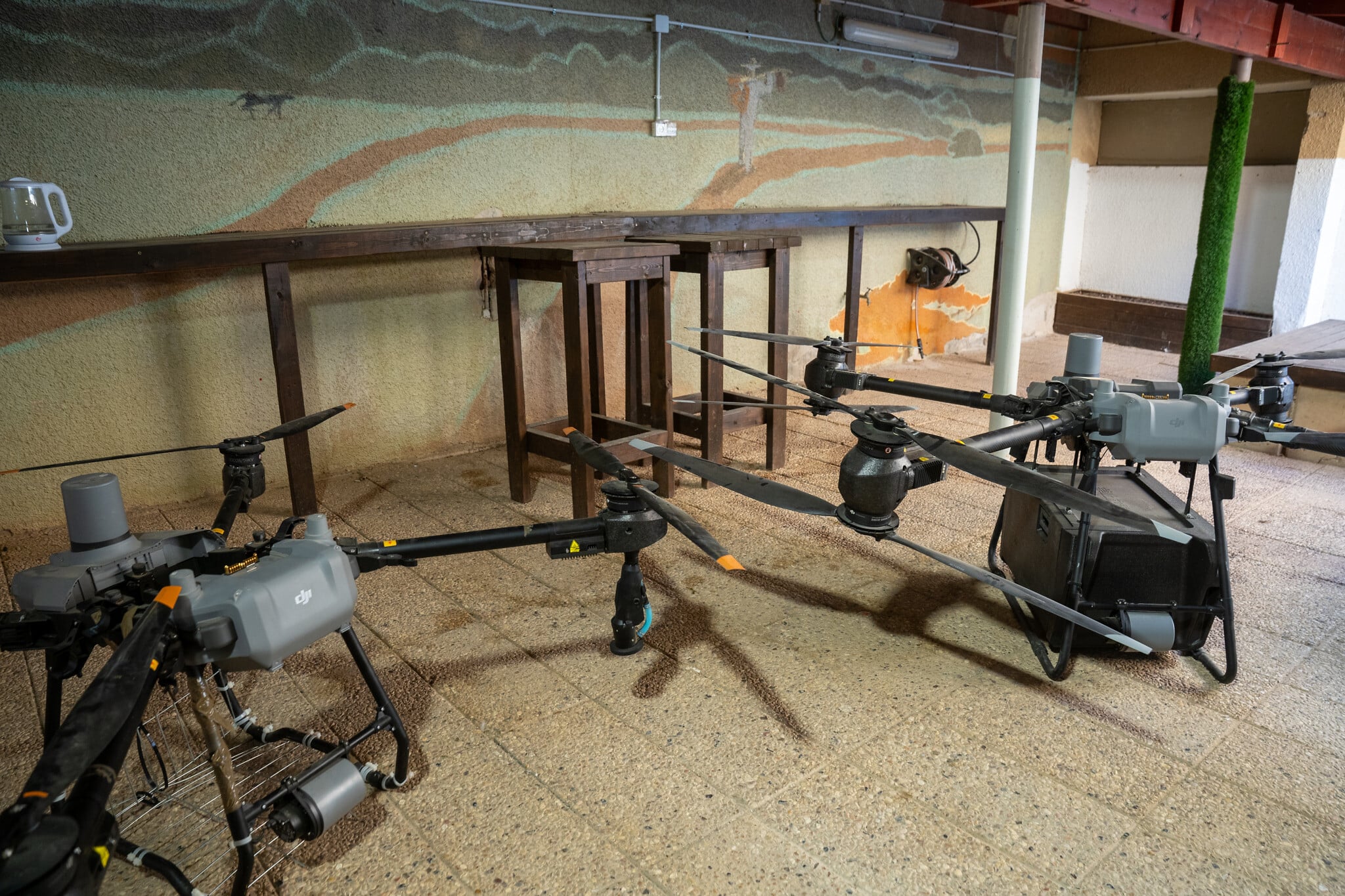 Large agricultural drones seized by IDF troops following gun smuggling attempts on the Egyptian border, as seen at an army base on November 16, 2025. (Emanuel Fabian/Times of Israel)