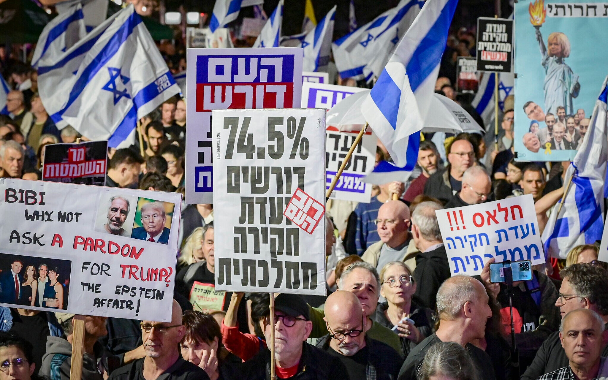 Anti-government protesters demand the establishment of a state commission of inquiry into the October 7 massacre, at Habima Square in Tel Aviv, November 15, 2025. (Avshalom Sassoni/Flash90)