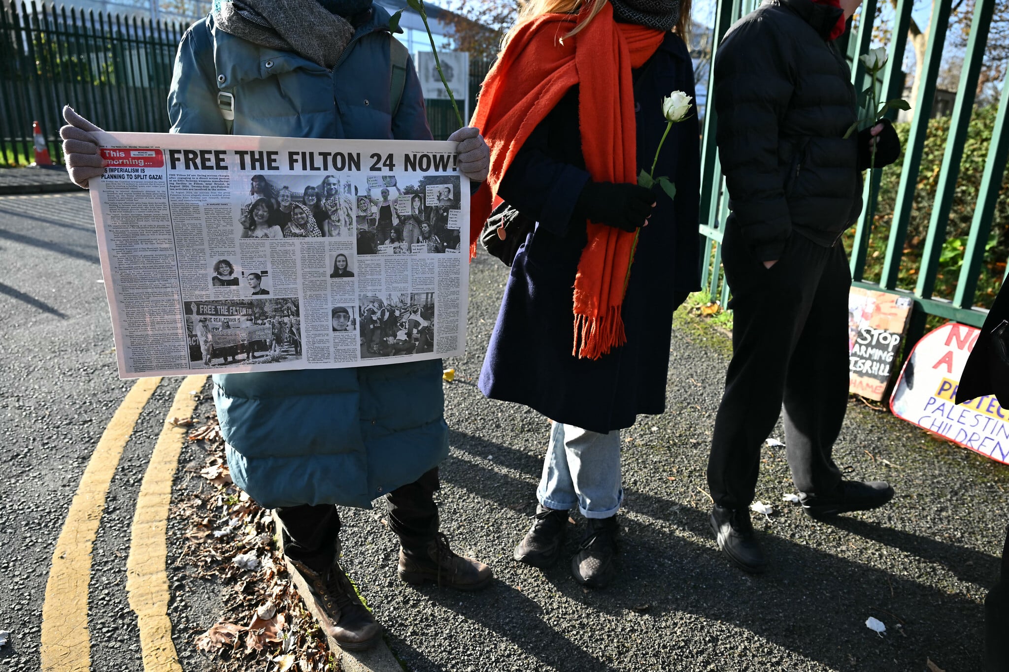 A group of around two dozen protesters, holding banners and Palestinian flags, gathered at the gates leading to Woolwich Crown Court, with their shouts of “Free Palestine” audible inside the courtroom ahead of the start of the trial.