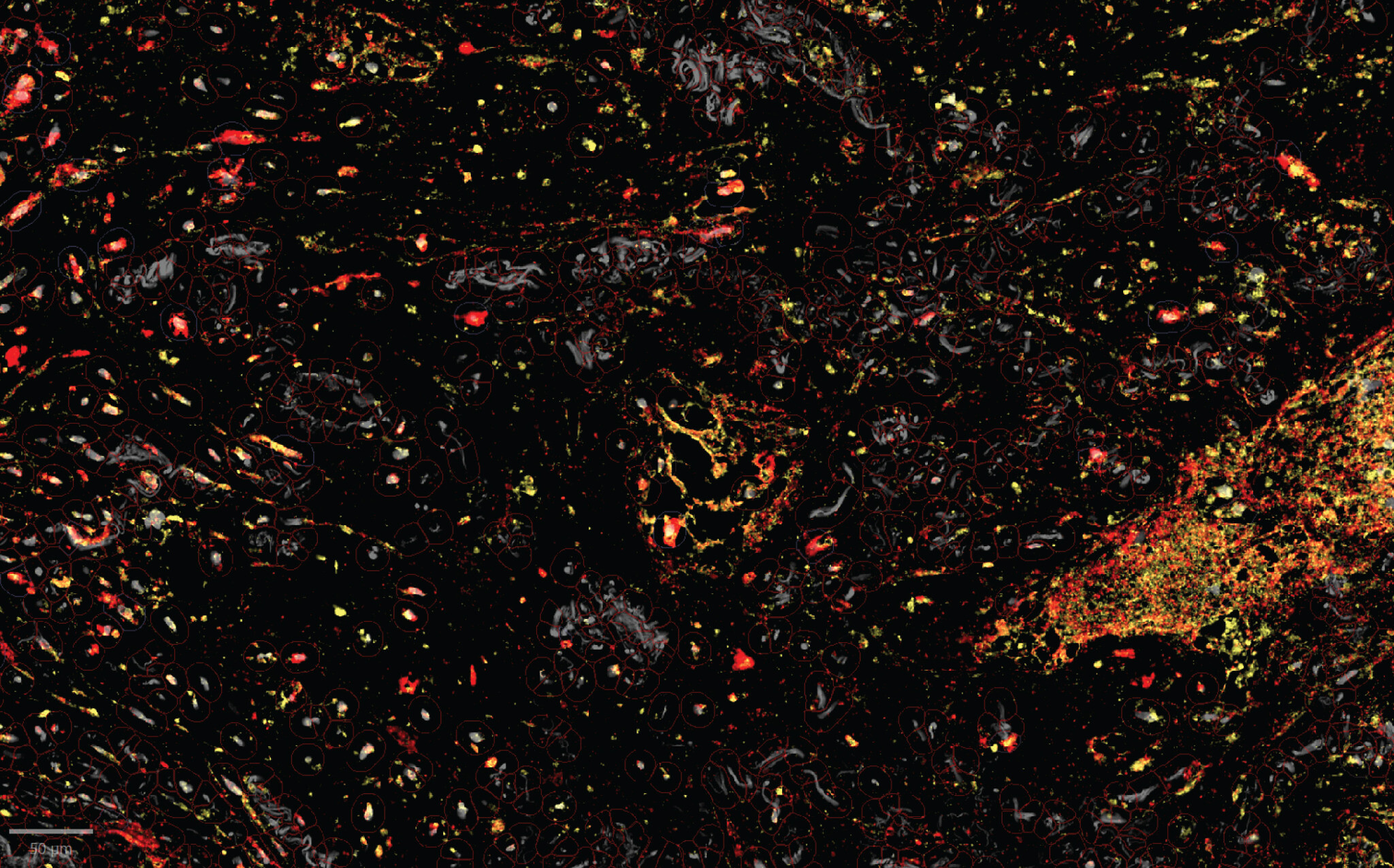 Human lung cancer tissue under a microscope. The enzymes (yellow) that unmask the immune-activating molecules are found near the TREM2 receptors (red) of the tumor-assisting macrophages. This targeted unmasking can prevent damage to healthy tissues. (Courtesy/Weizmann Institute of Science)