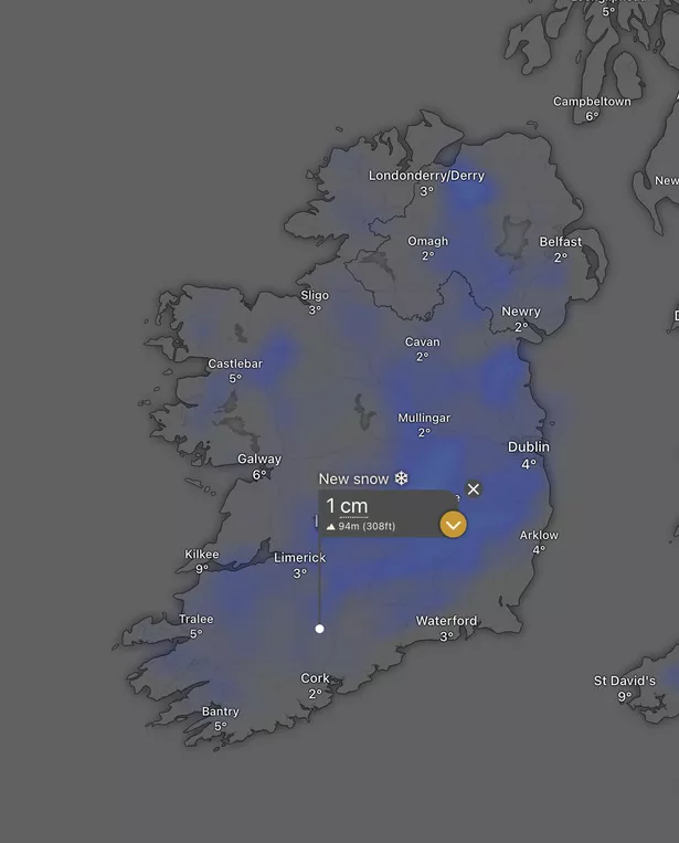 Current radars show a band of snowy showers moving in on Thursday morning, across Munster and the midlands at around midday, hanging around North Cork through the afternoon, an falling on the east coast by around 3pm before clearing to the east.