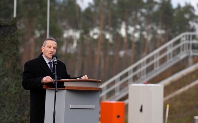 Defense Ministry director Amir Baram speaks at a ceremony marking the handover of Israel’s Arrow 3 missile defense system to the German Air Force at the Holzdorf Air Base, eastern Germany, on December 3, 2025. (Defense Ministry)