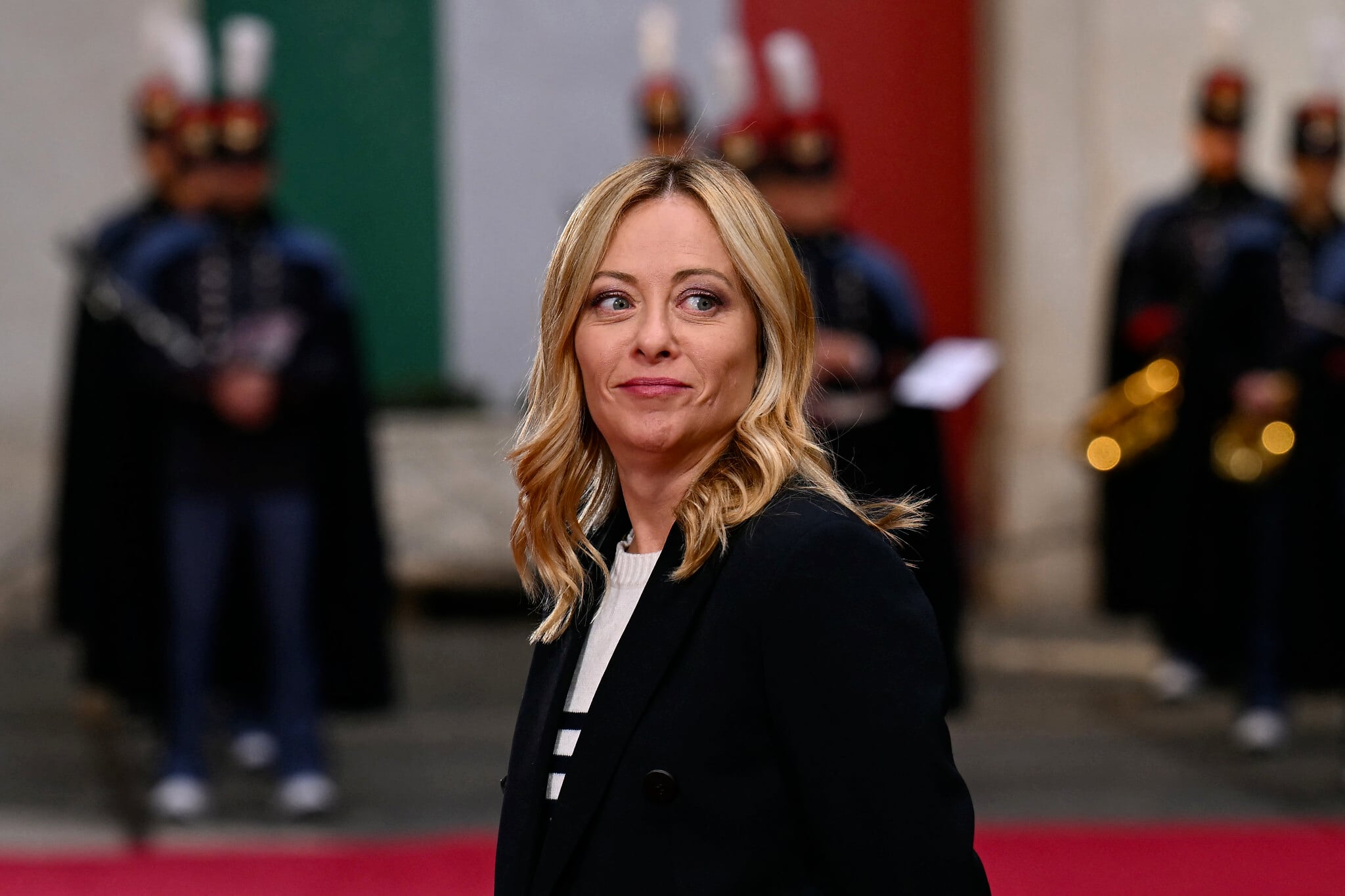 Italy’s Prime Minister Giorgia Meloni waits for Bulgaria’s Prime Minister Rosen Zhelyazkov at Palazzo Chigi prior to their meeting in Rome on December 1, 2025. (Filippo MONTEFORTE / AFP)