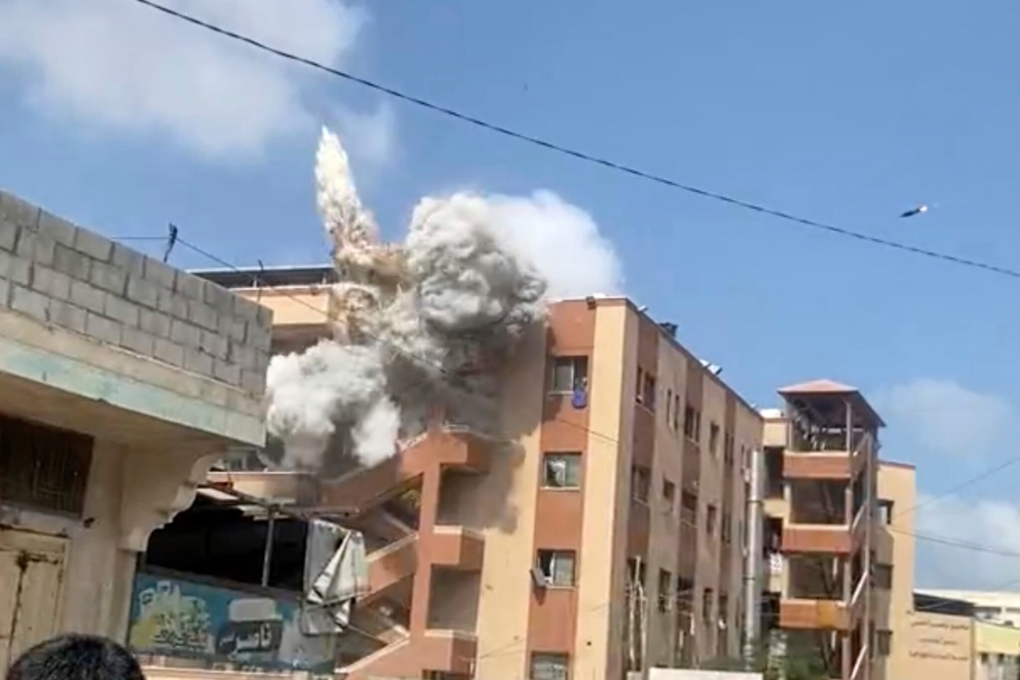 This frame grab from a video shows the second of two projectiles the Israeli army fired in quick succession at a stairwell outside Nasser Hospital, just minutes after an initial round of attacks hit the building in Khan Younis, Gaza Strip, Monday, Aug. 25, 2025. (UGC via AP)