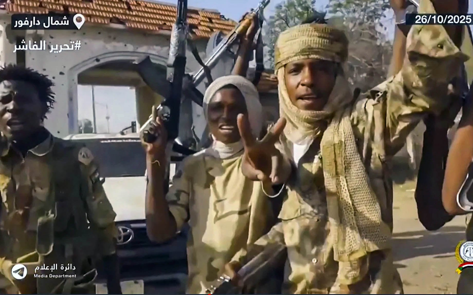 This image grab taken from handout video footage released on Sudan’s paramilitary Rapid Support Forces (RSF) Telegram account on October 26, 2025, shows RSF fighters holding weapons and celebrating in the streets of El-Fasher in Sudan’s Darfur. (RSF) / AFP)