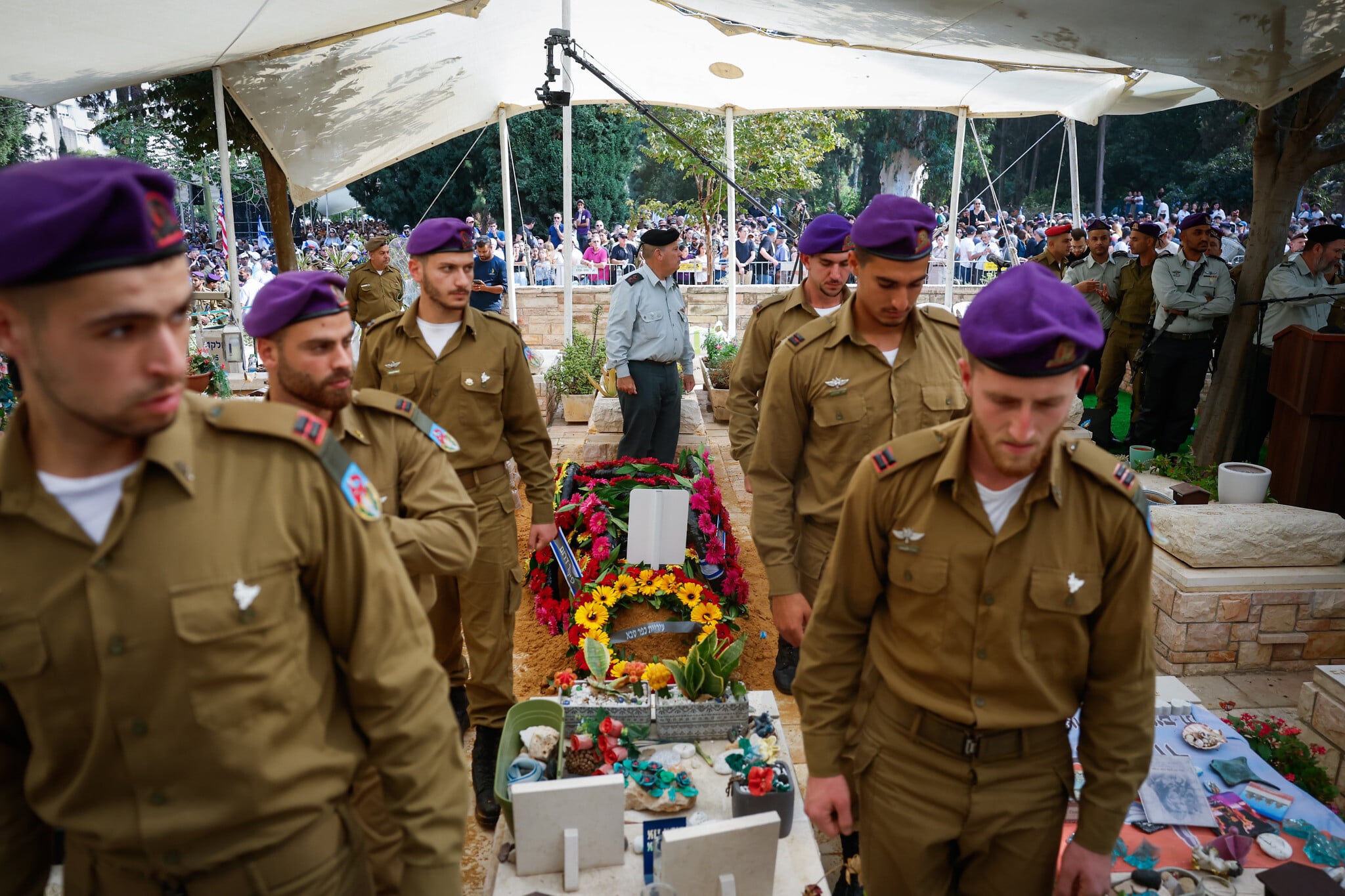 Soldiers stand flanking the grave of IDF Lt. Hadar Goldin, whose body had been held captive by Hamas in Gaza since 2014, at the Kfar Saba military cemetery on November 11, 2025. (Chaim Goldberg/Flash90)