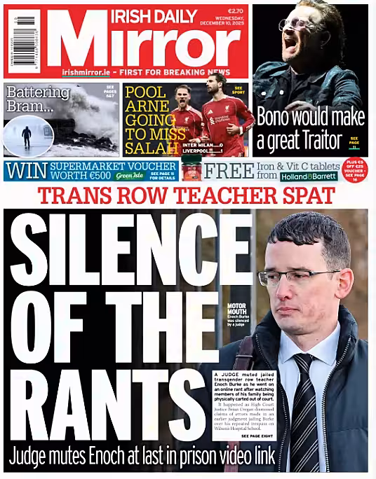 The Irish Daily Mirror leads with the judge in Enoch Burke’s trial muting him after he went on a rant online.