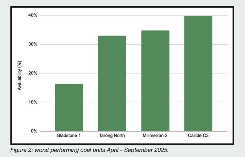 The worst performer was the 49 year-old Gladstone power station, which had 33 unscheduled outages over the six months. The worst performing units were Gladstone 1, Tarong North, Millmerran 2, Callide C3, all being available less than 50% of the time.