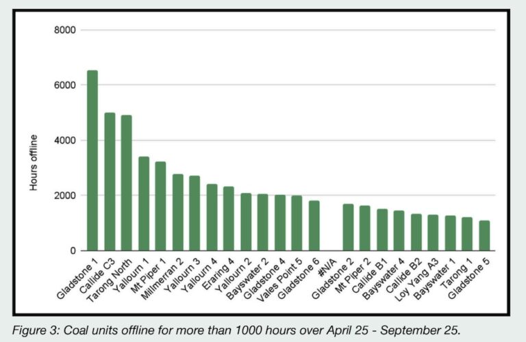 Across the NEM, 24 coal-fired power station units were entirely offline for more than 1000 hours during the six-month period, including all units at Gladstone, Bayswater and Yallourn, except for Bayswater 3.