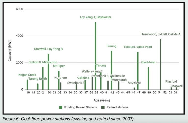 According to the report, the average age of coal plants on the NEM is 35 years. The average age of retirement of the 12 coal plants that have closed since 2007 was 45 years. Figure 6 shows that many still operating coal plants are older than those that have already retired due to old age.