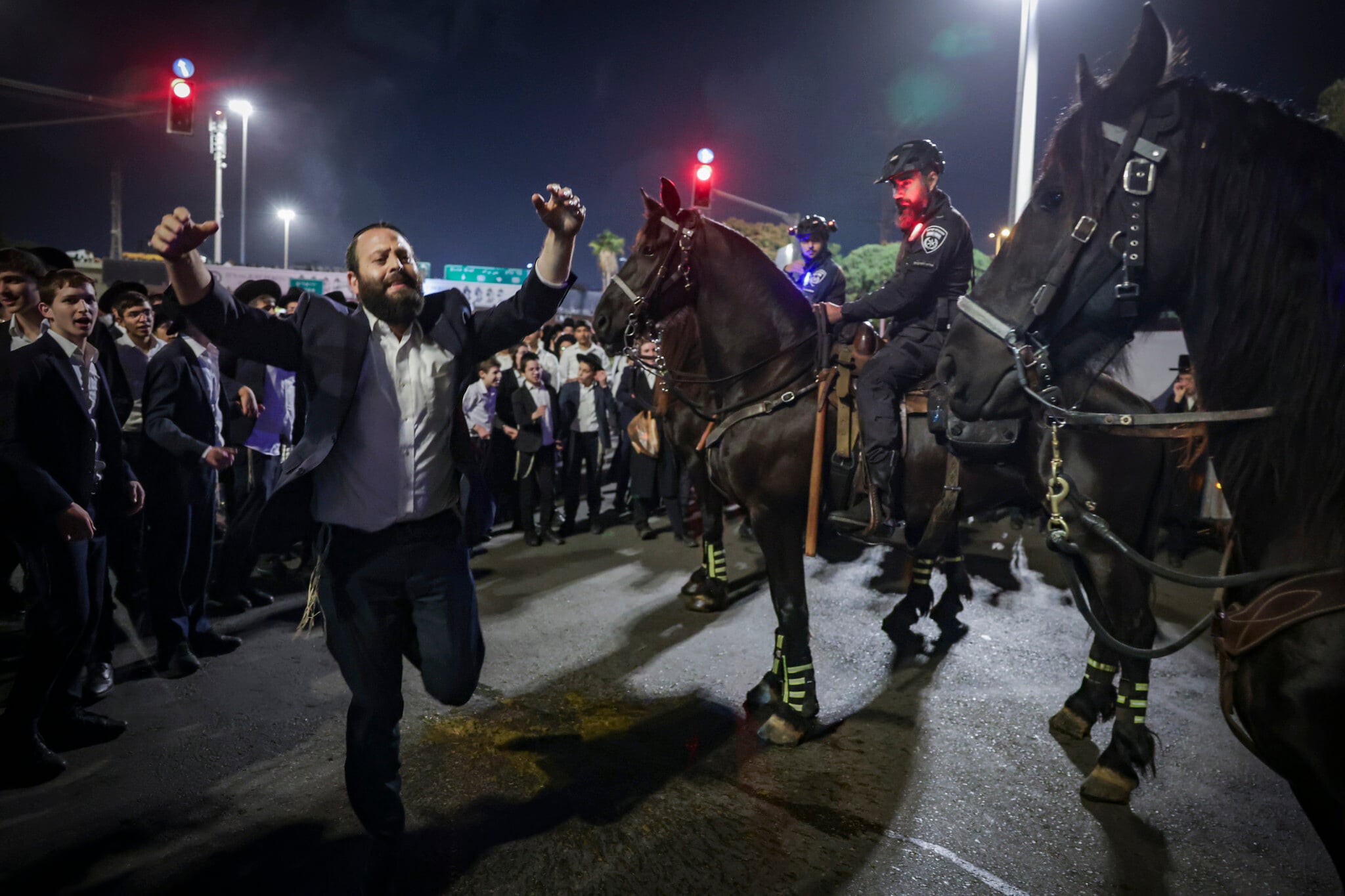 Ultra-Orthodox men block Route 4 during a protest against the jailing of yeshiva students who failed to comply with an IDF draft order, Bnei Brak, December 8, 2025. (David Cohen/Flash90)