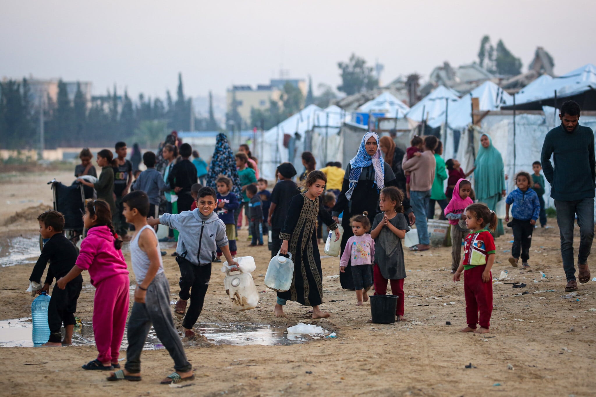 People fill their containers with water at the Nuseirat camp for displaced Palestinians in the central Gaza Strip on December 4, 2025. (Eyad Baba / AFP)