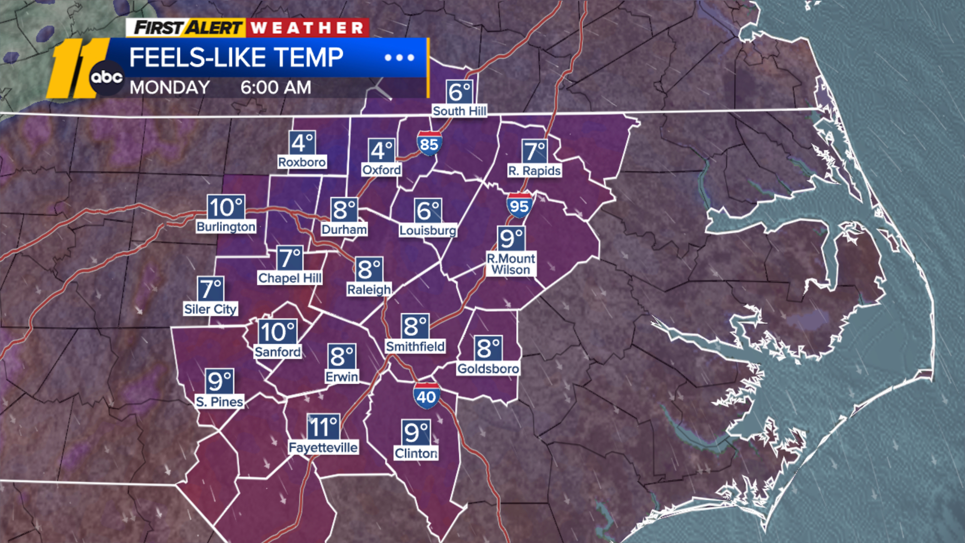 RALEIGH, N.C. (WTVD) — Arctic air is set to plunge temperatures into the teens Sunday night, with widespread wind chills in the single digits expected through mid-morning Monday.