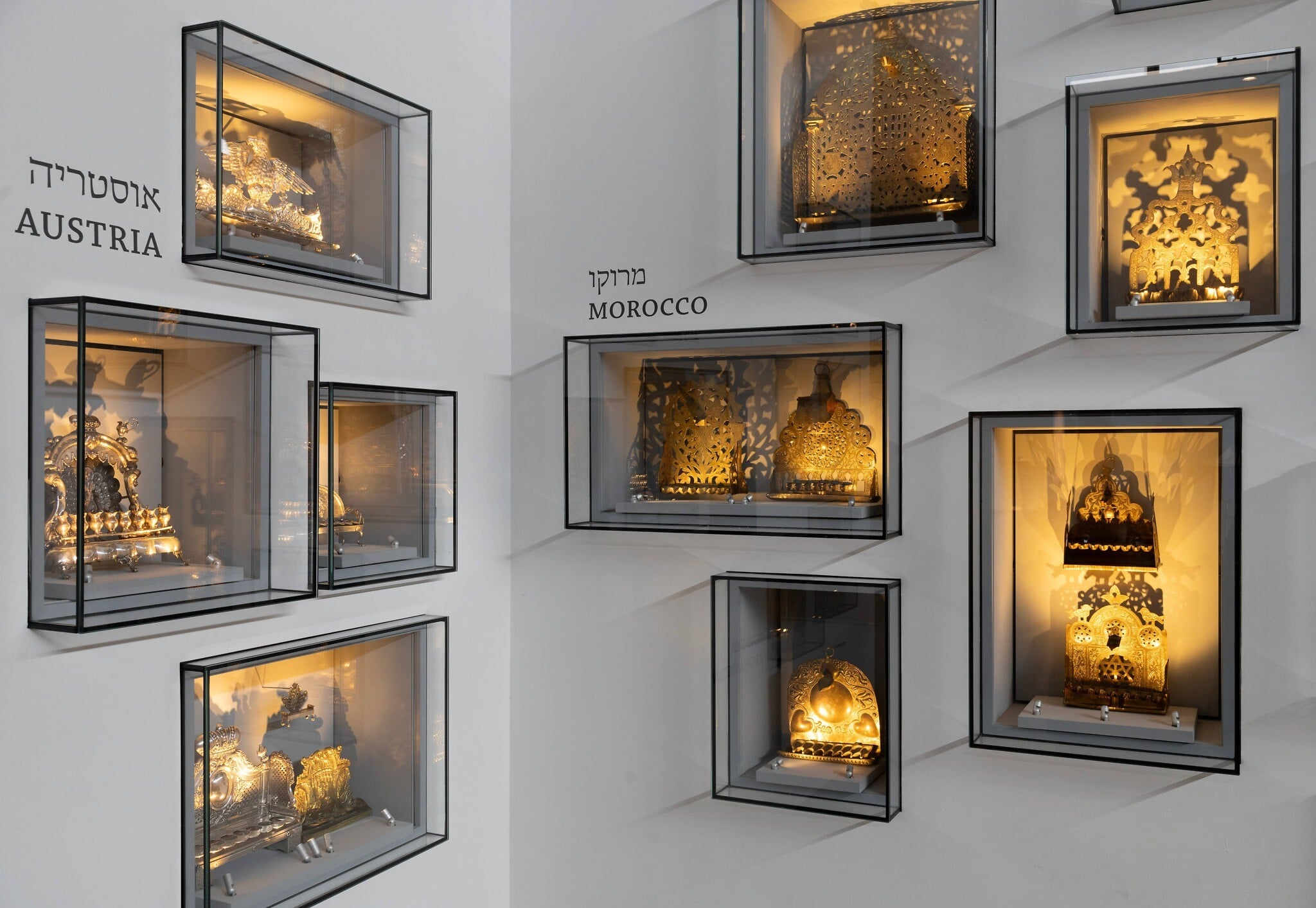 Following this tradition, many Jews choose the light menorahs in glass boxes outside of their buildings. Those glass boxes inspire the exhibition featuring menorahs from across the centuries and the Jewish world at the Ticho House in Jerusalem’s city center (part of the Israel Museum).
