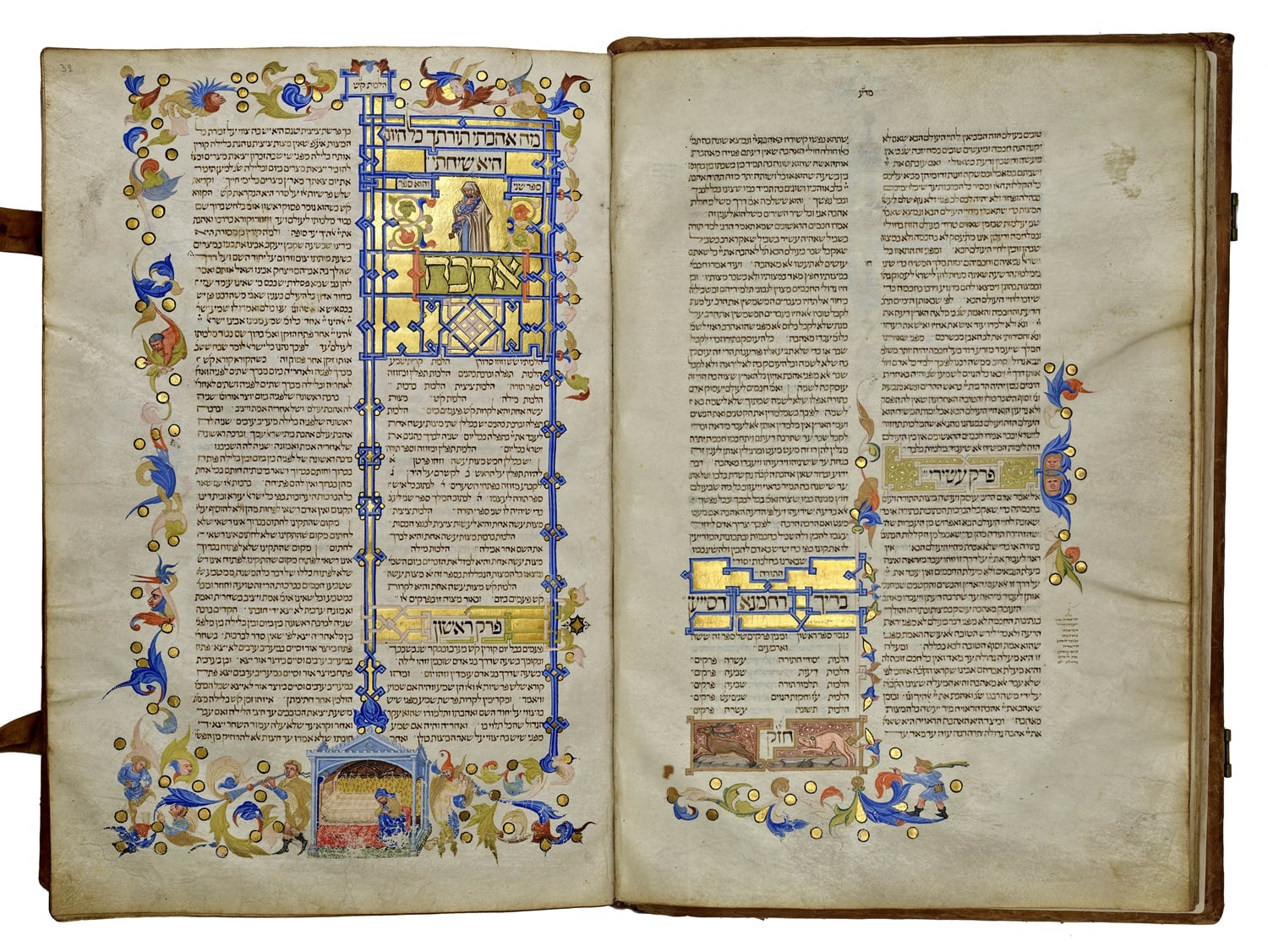 The artifacts include an illuminated 14th-century manuscript of Maimonides’ fundamental work Mishneh Torah, which encompasses all aspects of Jewish law, on display for the first time. The manuscript was first copied in Provence between 1300 and 1350, later brought to Spain, and decorated with illustrations and motifs of human figures, animals, and plants by the artist Matteo di Ser Cambio. The Mishne Torah covers the laws of Hanukkah in depth.