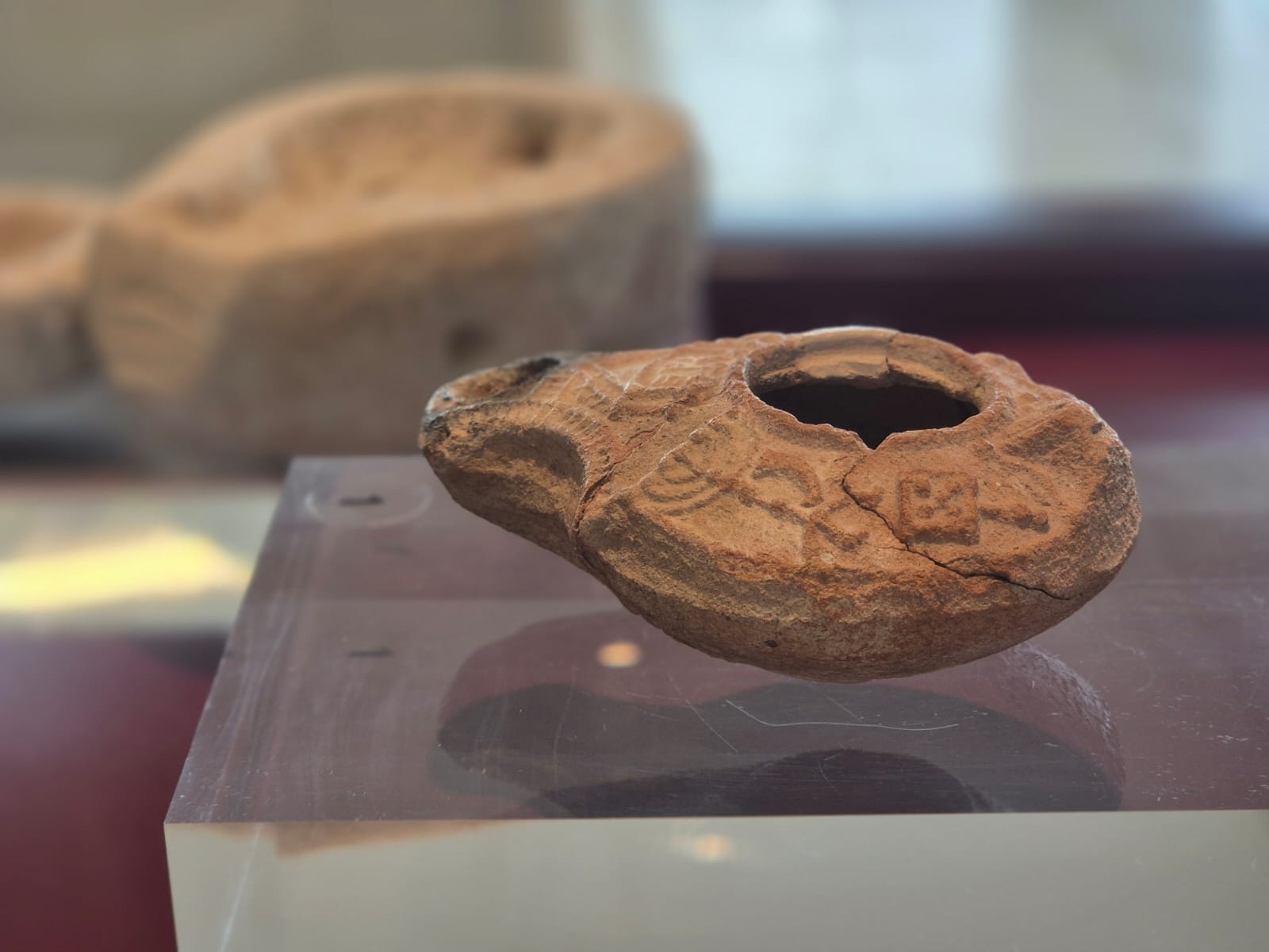A clay lamp decorated with symbols from the Temple dating back to the 3rd-5th centuries CE is one of the items on display.