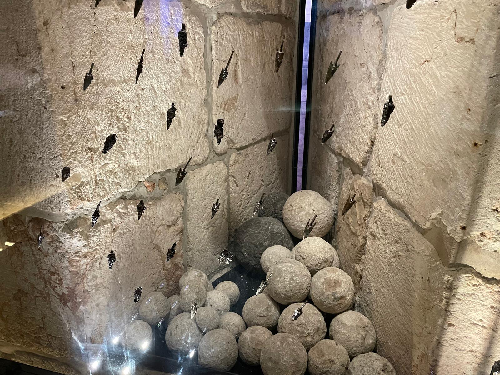 Arrowheads and catapult balls used by the army of Greek king Antiochus VII Sidetes, a descendant of the Maccabees’ foe Antiochus IV Epiphanes, as they laid siege to Jerusalem in 134 BCE on display at the Tower of David Jerusalem Museum. (Rossella Tercatin/Times of Israel).