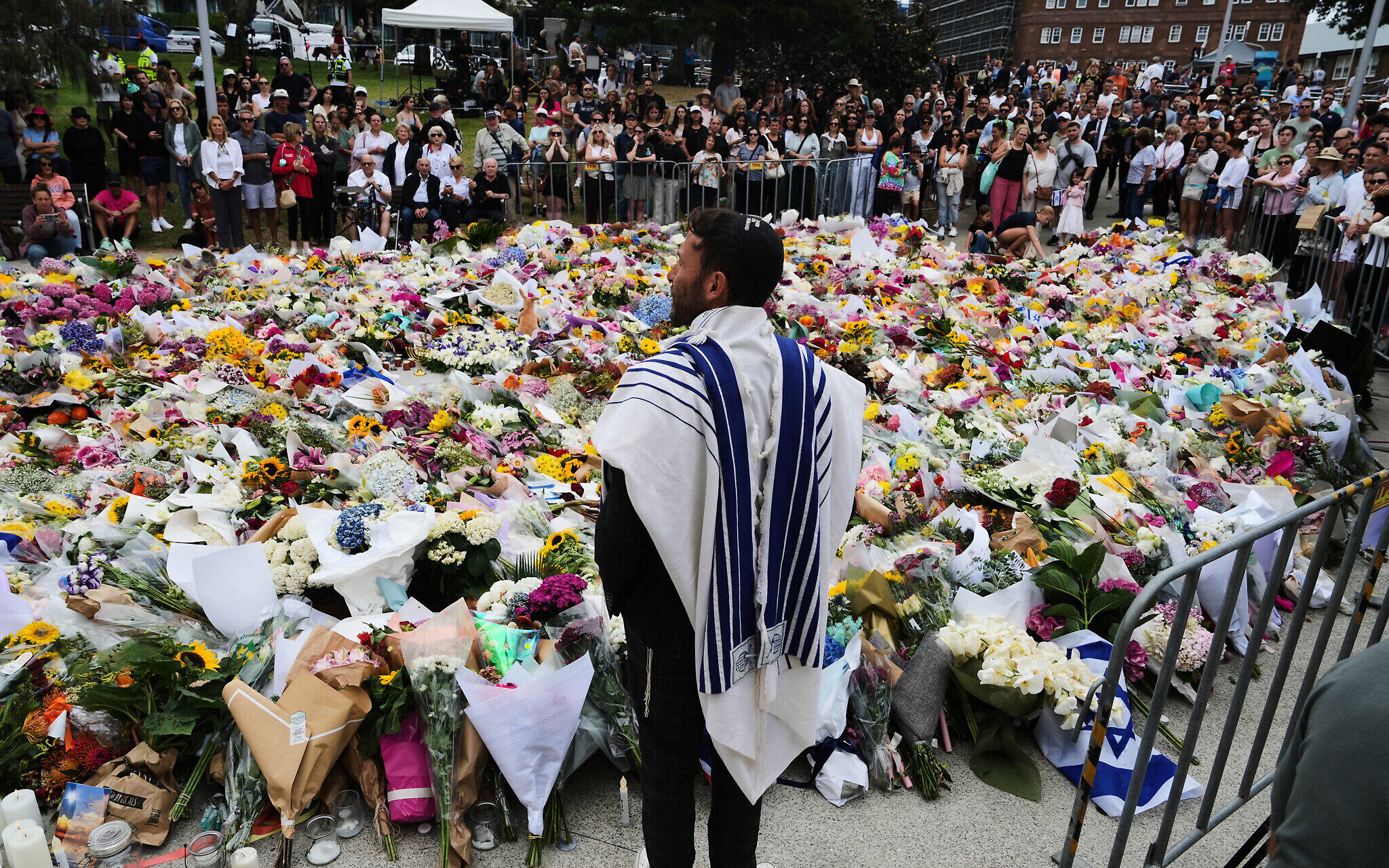Rabbi Yossi Friedman speaks to people gathering at a flower memorial by the Bondi Pavilion at Bondi Beach, December 16, 2025, following Sunday’s antisemitic terror attack in Sydney, Australia. (AP Photo/Mark Baker)