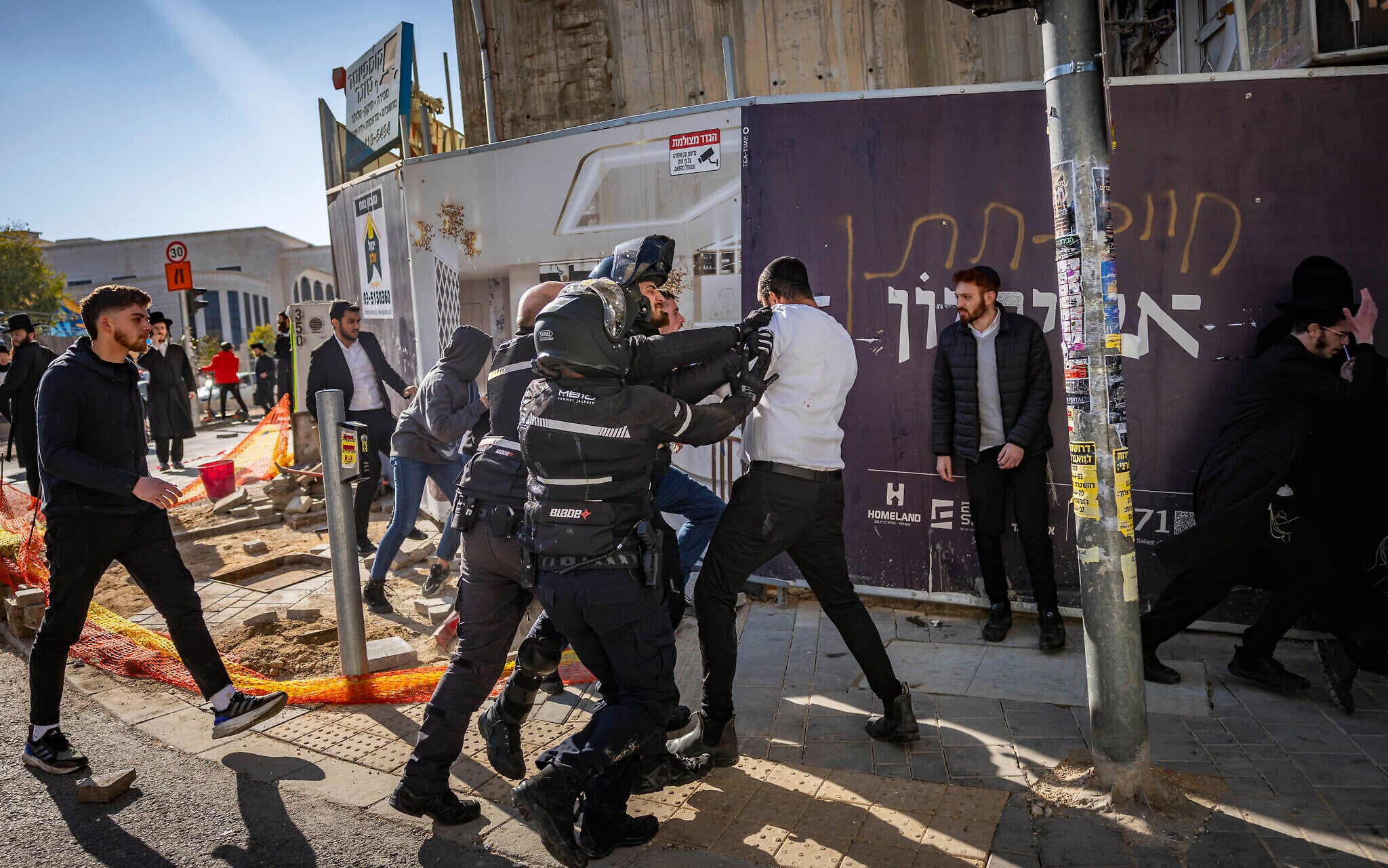Ultra-Orthodox Jewish men clash with police during a protest following the issuance of a parking ticket, in Jerusalem, on December 18, 2025. (Yonatan Sindel/Flash90)