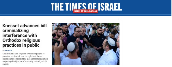 A headline on yesterday’s Times of Israel might have made you blink. In the midst of everything going on in Israel, the Knesset is pursuing legislation that would criminalize “interference” with “Orthodox religious practices”?