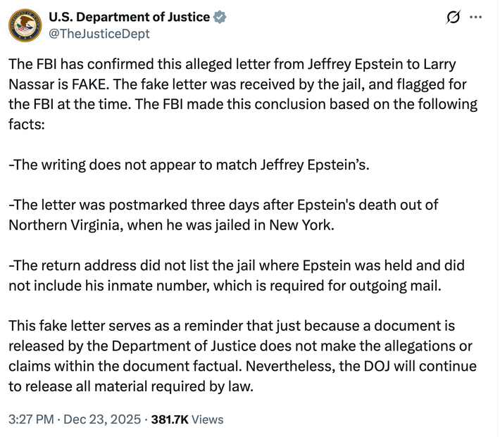 Later on Tuesday, the DOJ announced that the letter is “FAKE,” without providing any documentation to back up this claim or explaining how this forgery ended up in the Epstein files: