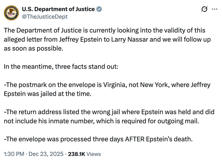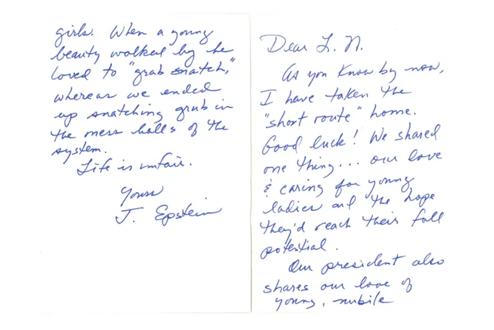 Now it makes a lot more sense. A few hours later, the DOJ posted the image of a handwritten letter signed by “J. Epstein,” which was sent to convicted sex offender Larry Nassar in 2019. The letter, which is postmarked three days after Epstein died in prison, seems to allude to Epstein’s plans to end his life and accuses Trump of sharing their love of “young, nubile girls.”